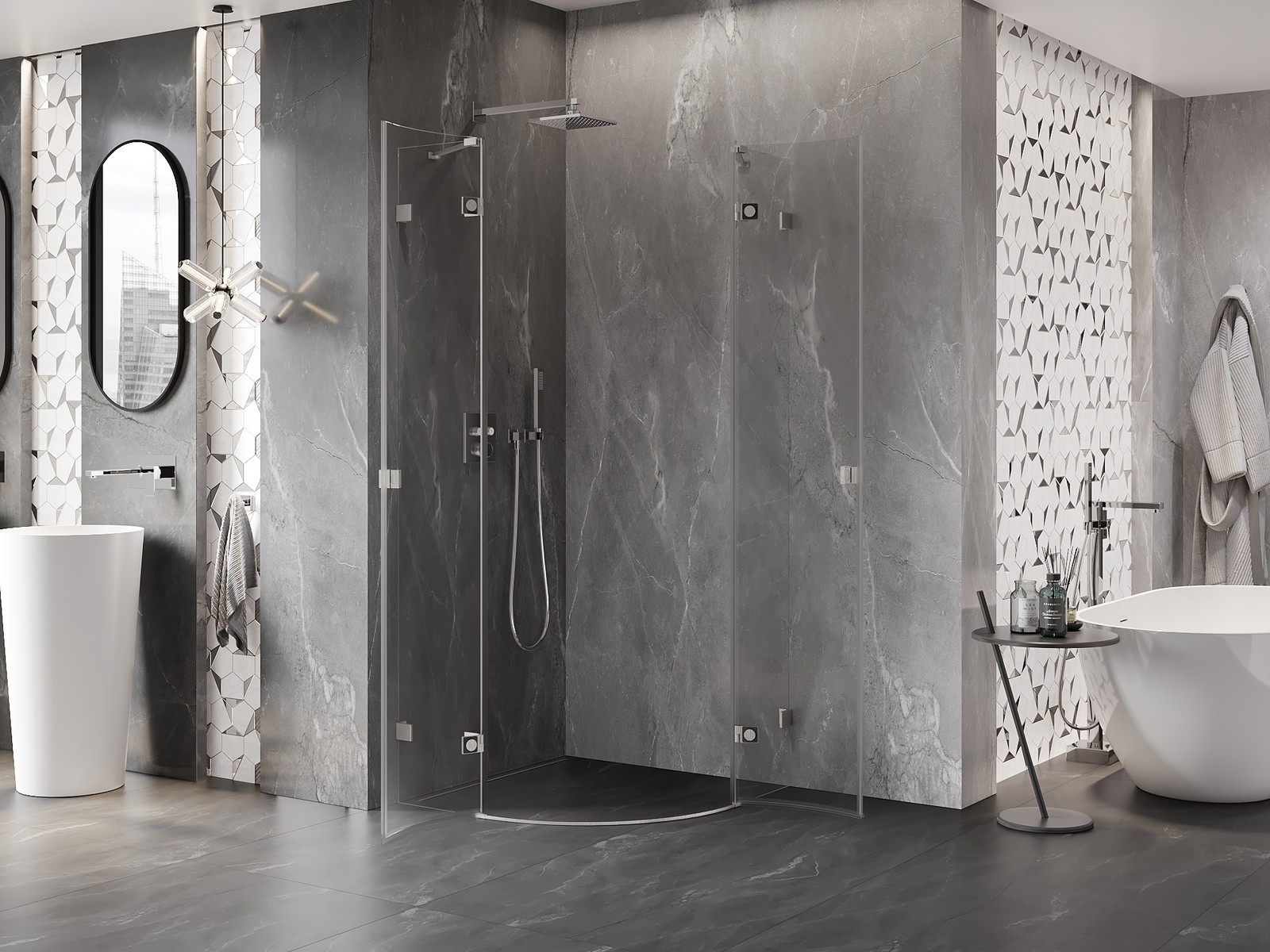 Mexen Lunar je elegantna polkrožna tuš kabina dimenzij 90x90 cm. Poudarjena je s prozornim kaljenim steklom debeline 8 mm, kar zagotavlja izjemno vzdržljivost in varnost. Univerzalna stran montaže in nihajna vrata omogočajo vsestranskost pri instalaciji. Kabina ima brušen nikelj zaključek in aluminijasti profil, kar dodaja sodoben videz. Opremljena je s prevleko za lažje čiščenje in mehanizmom za dviganje in spuščanje vrat, kar zagotavlja udobje pri uporabi. Zaradi možne regulacije širine in dveh sistemov pritrjevanja se kabina odlično prilagaja vsaki kopalnici. Možna montaža tako na podstavek kot na ploščice.