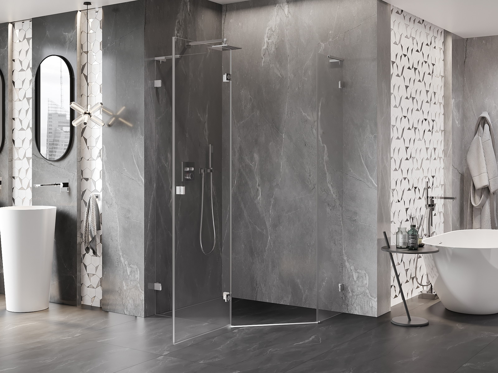 Priročen in udoben ročaj je izdelan iz trpežnega in odpornega kovine. Modna oblika v kombinaciji z zaključkom, ki ustreza barvi profilov, daje celoti sodoben in stilski videz, poudarjajoč estetiko vsake kopalnice.