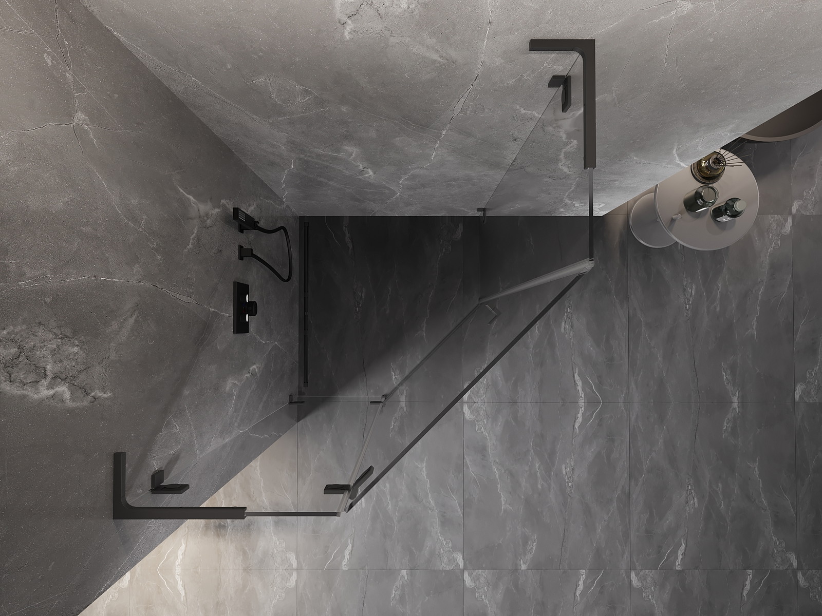 Priročen in udoben ročaj je izdelan iz trpežnega in odpornega kovine. Modna oblika v kombinaciji z zaključkom, ki ustreza barvi profilov, daje celoti sodoben in stilski videz, poudarjajoč estetiko vsake kopalnice.