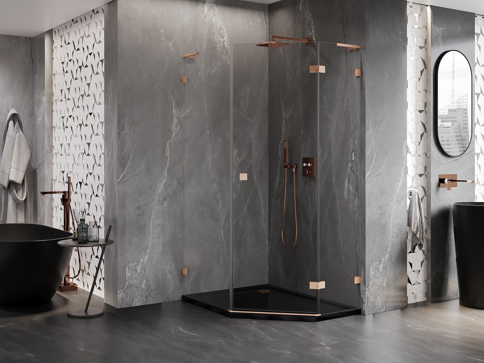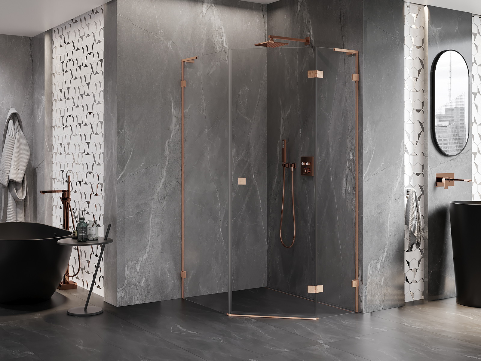 Mexen Lunar L pravilna pentagonalna tuš kabina s tečajnimi vrati 80 x 100 cm, prozorna, krtačeni baker