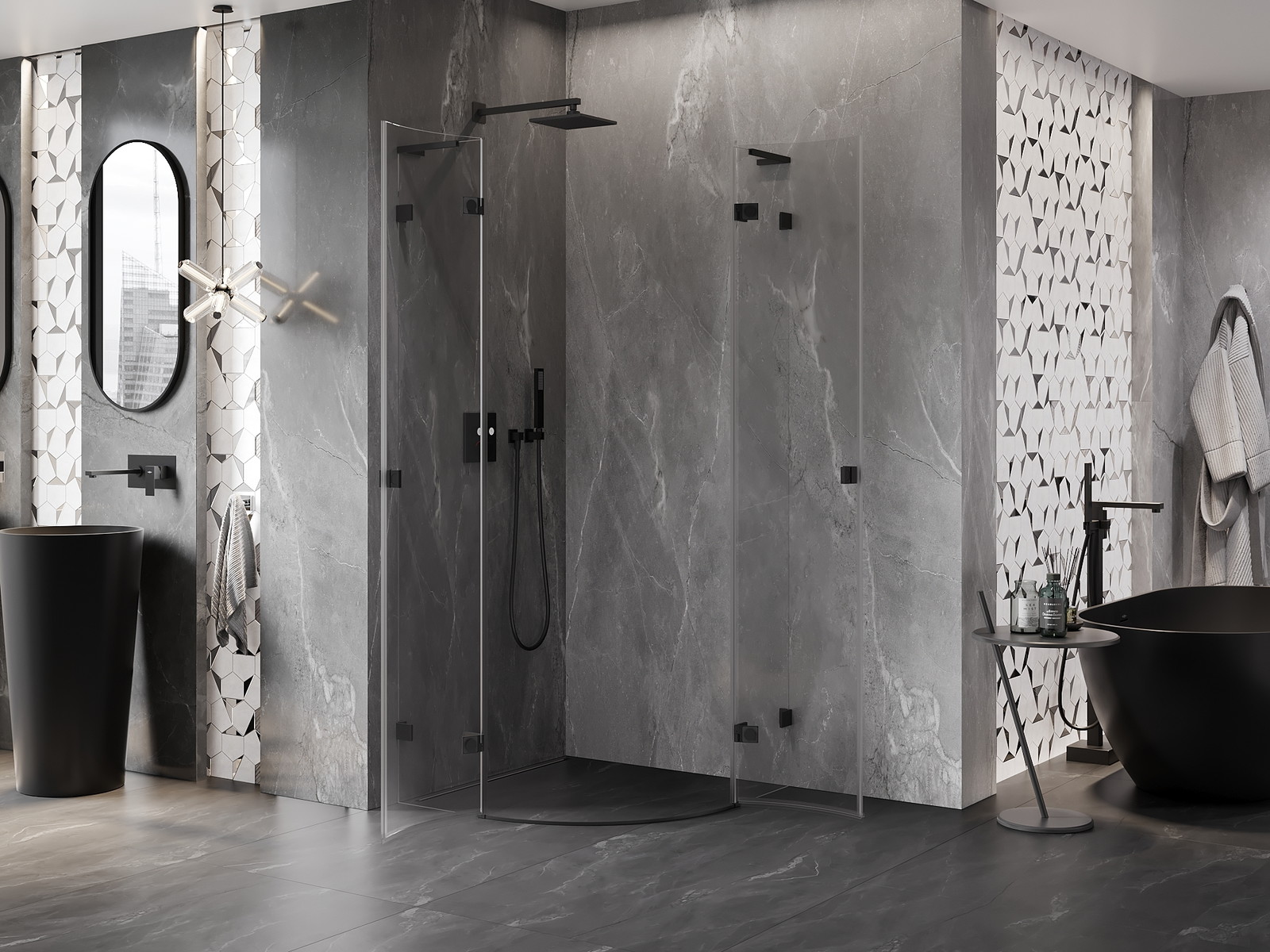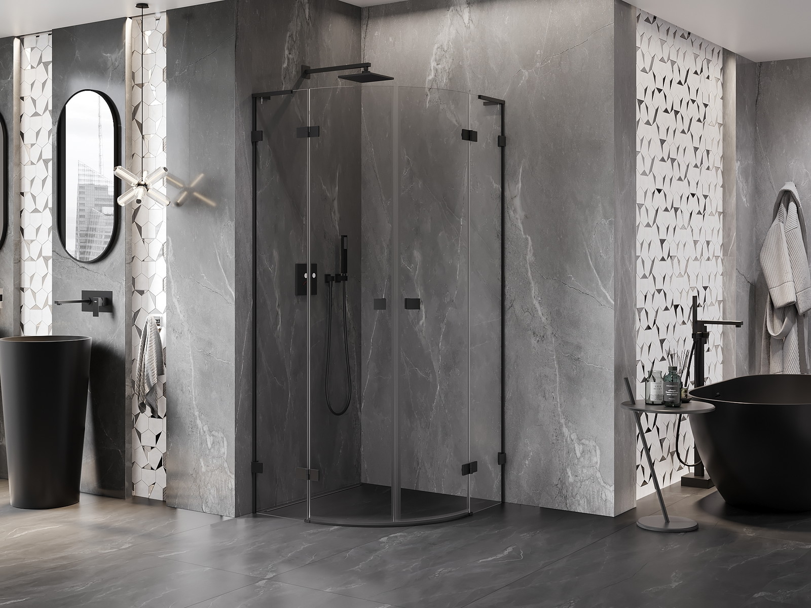 Priročen in udoben ročaj je izdelan iz trpežnega in odpornega kovine. Modna oblika v kombinaciji z zaključkom, ki ustreza barvi profilov, daje celoti sodoben in stilski videz, poudarjajoč estetiko vsake kopalnice.