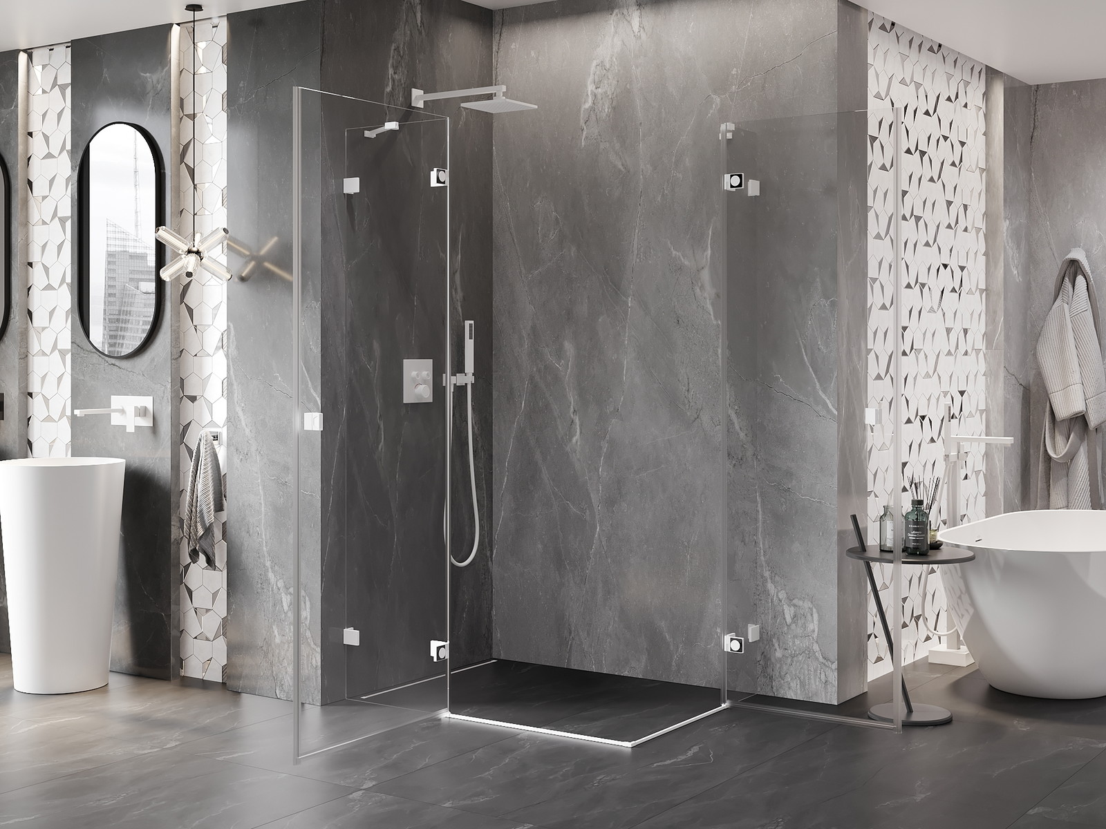 Priročen in udoben ročaj je izdelan iz trpežnega in odpornega kovine. Modna oblika v kombinaciji z zaključkom, ki ustreza barvi profilov, daje celoti sodoben in stilski videz, poudarjajoč estetiko vsake kopalnice.