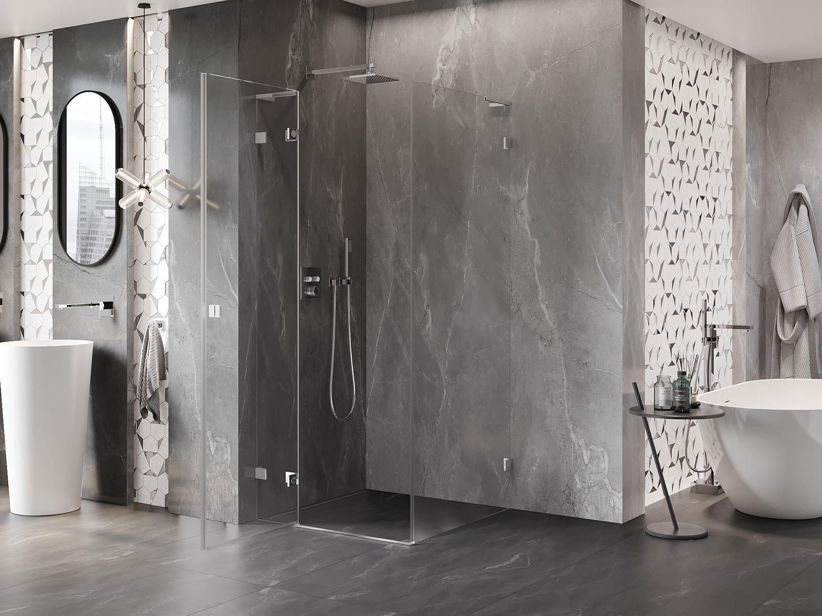 Priročen in udoben ročaj je izdelan iz trpežnega in odpornega kovine. Modna oblika v kombinaciji z zaključkom, ki ustreza barvi profilov, daje celoti sodoben in stilski videz, poudarjajoč estetiko vsake kopalnice.