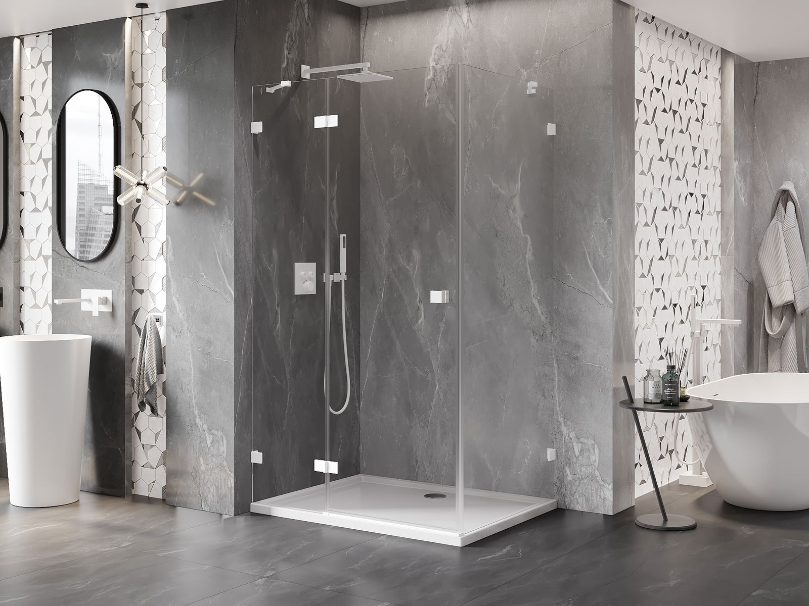 Priročen in udoben ročaj je izdelan iz trpežnega in odpornega kovine. Modna oblika v kombinaciji z zaključkom, ki ustreza barvi profilov, daje celoti sodoben in stilski videz, poudarjajoč estetiko vsake kopalnice.