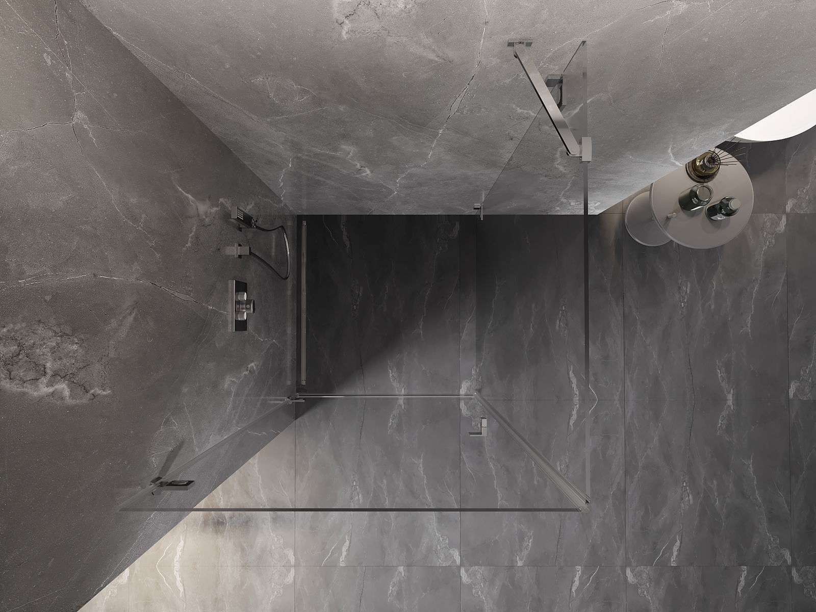 Priročen in udoben ročaj je izdelan iz trpežnega in odpornega kovine. Modna oblika v kombinaciji z zaključkom, ki ustreza barvi profilov, daje celoti sodoben in stilski videz, poudarjajoč estetiko vsake kopalnice.