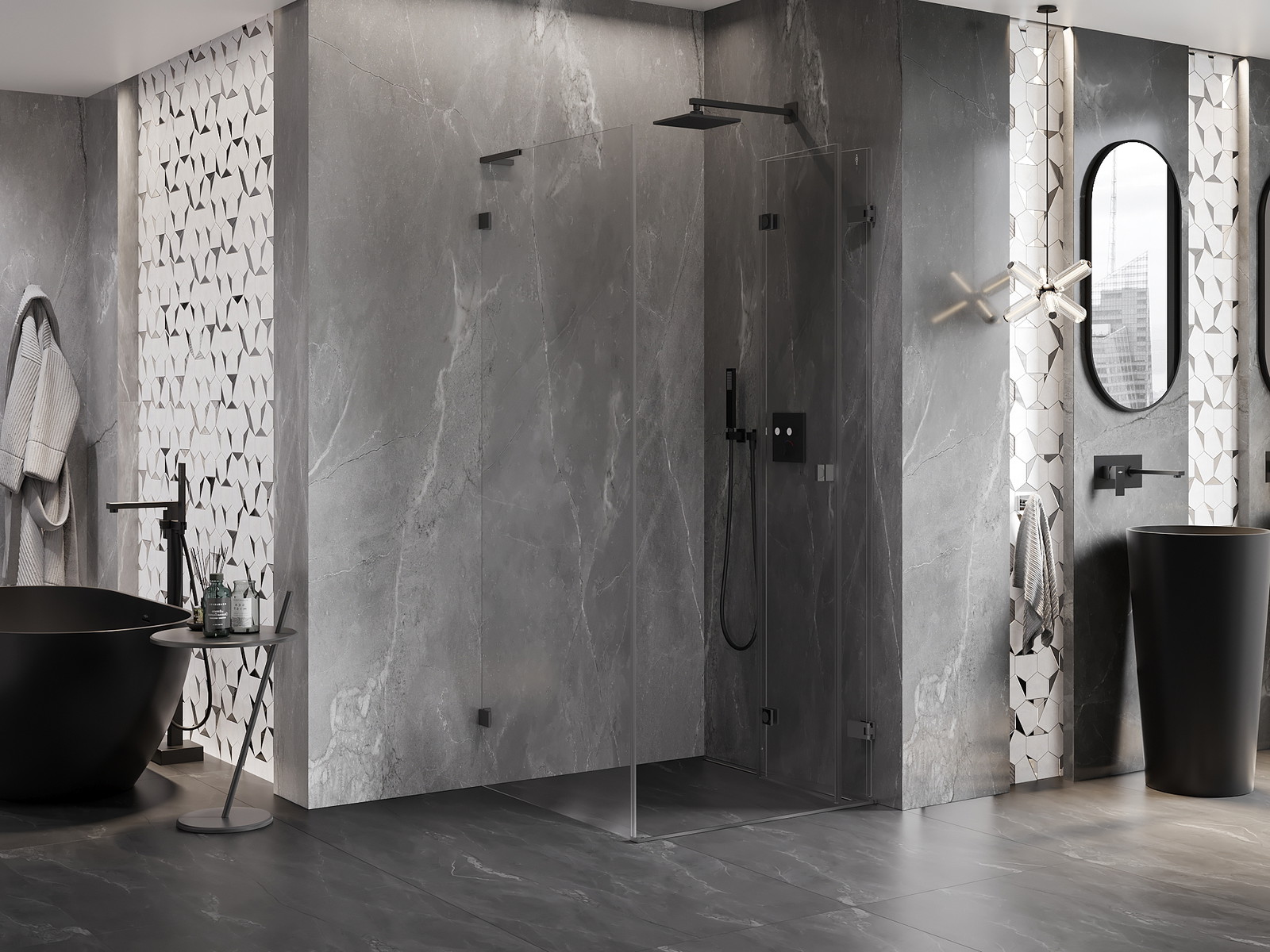 Priročen in udoben ročaj je izdelan iz trpežnega in odpornega kovine. Modna oblika v kombinaciji z zaključkom, ki ustreza barvi profilov, daje celoti sodoben in stilski videz, poudarjajoč estetiko vsake kopalnice.