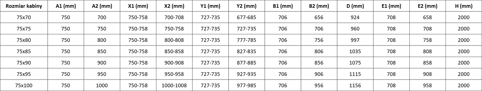 Tuš kabine, vrata in stene so standardno prilagojene za montažo na tuš kadi določenih dimenzij. Te dimenzije so navedene v imenu ali opisu izdelka. Vendar je treba upoštevati, da se dejanske mere elementov lahko nekoliko razlikujejo od nazivnih vrednosti. V primeru načrtovane montaže neposredno na tla je priporočljivo natančno preveriti zunanje mere in razporeditev elementov v skladu s tehnično risbo.