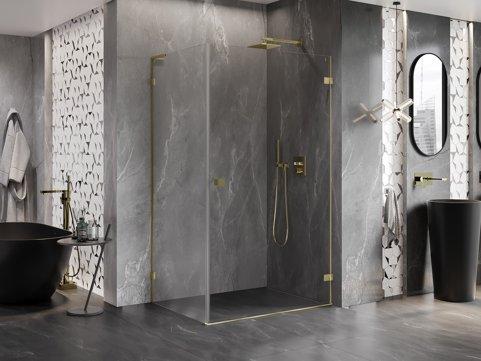 Tuš kabina Mexen Lunar-B L združuje eleganco z vsestranskostjo. Velikost 100x90 cm zagotavlja prostornost, višina 200 cm pa idealno zaščito pred pršenjem. Nihajna vrata na desni strani in prozorno, kaljeno steklo debeline 6 mm (vrata) ter 8 mm (stena) zagotavljajo trpežnost in varnost. Zlati brušen aluminijast profil dodaja luksuz, mehanizem dviga in spusta vrat pa zagotavlja udobje. Dva sistema pritrjevanja in možnost montaže na tuš kad ali ploščice omogočata prilagodljivost.