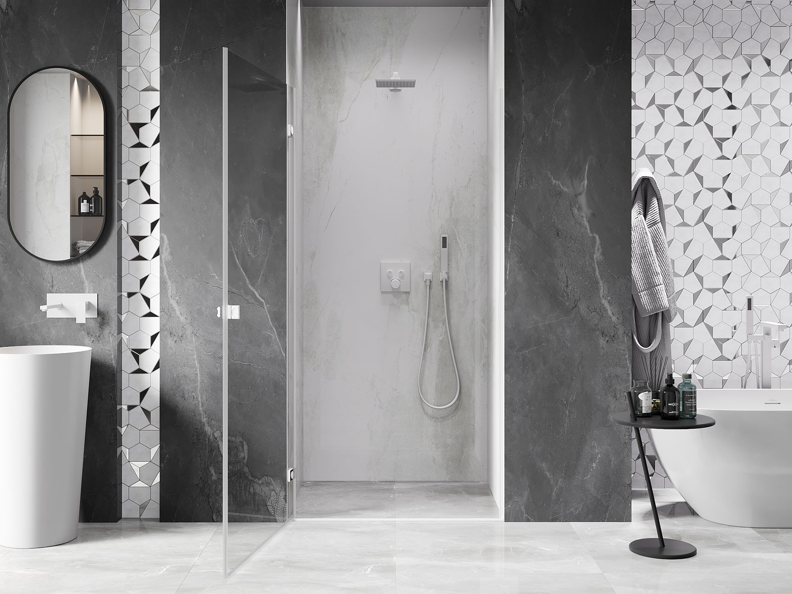 Priročen in udoben ročaj je izdelan iz trpežnega in odpornega kovine. Modna oblika v kombinaciji z zaključkom, ki ustreza barvi profilov, daje celoti sodoben in stilski videz, poudarjajoč estetiko vsake kopalnice.