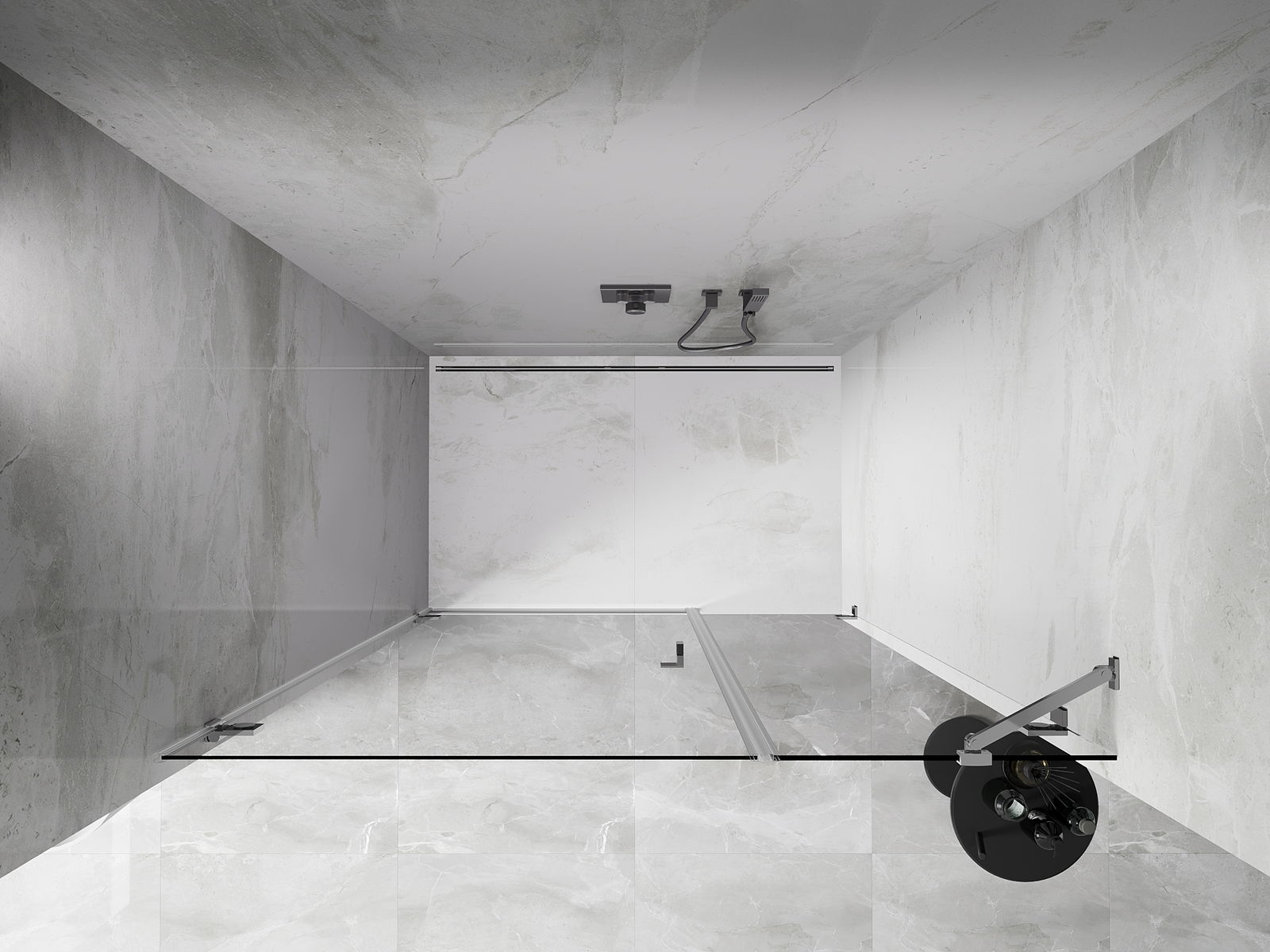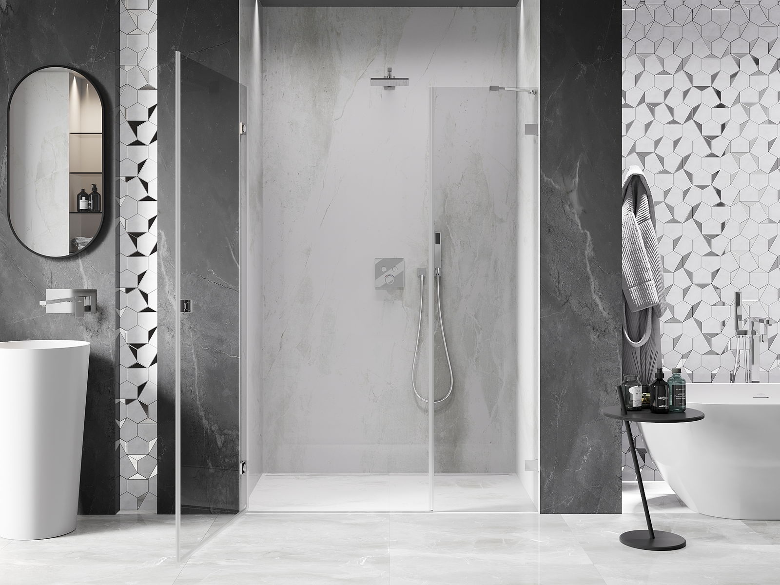 Priročen in udoben ročaj je izdelan iz trpežnega in odpornega kovine. Modna oblika v kombinaciji z zaključkom, ki ustreza barvi profilov, daje celoti sodoben in stilski videz, poudarjajoč estetiko vsake kopalnice.