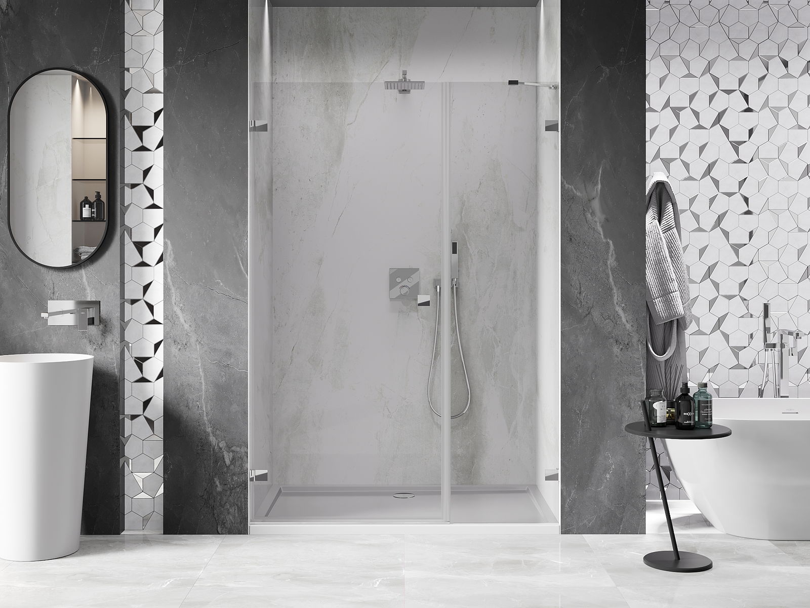 Priročen in udoben ročaj je izdelan iz trpežnega in odpornega kovine. Modna oblika v kombinaciji z zaključkom, ki ustreza barvi profilov, daje celoti sodoben in stilski videz, poudarjajoč estetiko vsake kopalnice.