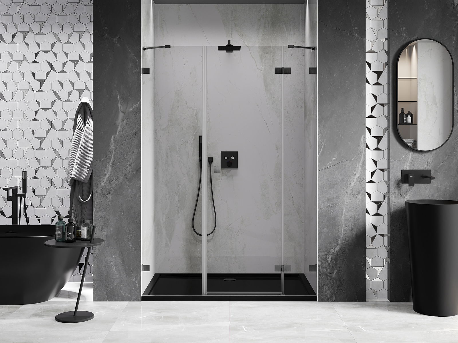 Priročen in udoben ročaj je izdelan iz trpežnega in odpornega kovine. Modna oblika v kombinaciji z zaključkom, ki ustreza barvi profilov, daje celoti sodoben in stilski videz, poudarjajoč estetiko vsake kopalnice.