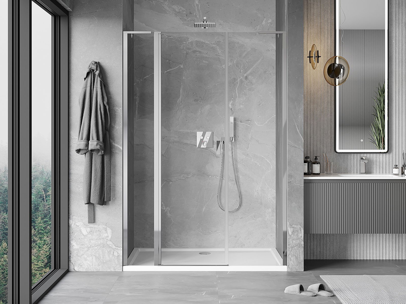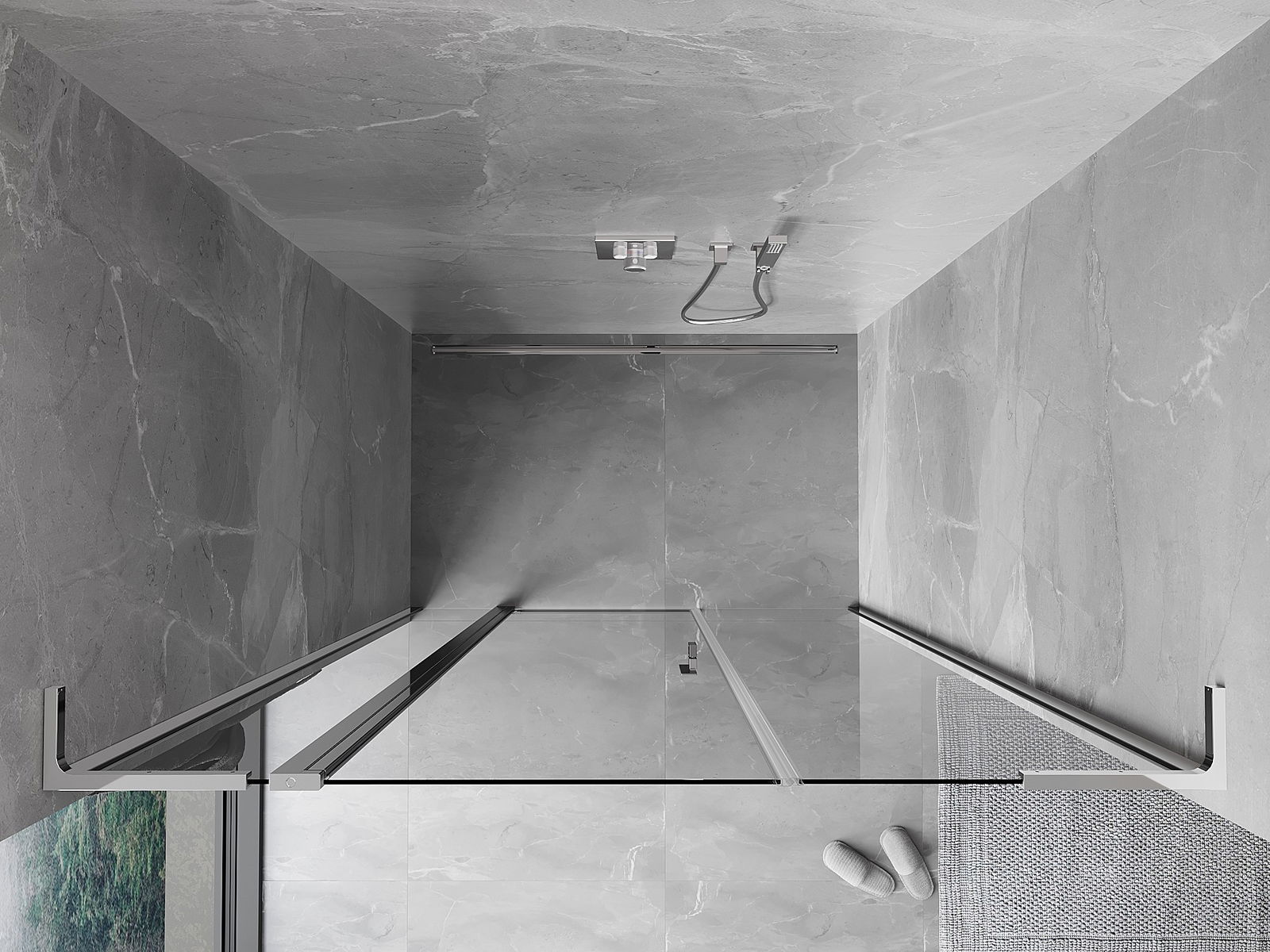 Priročen in udoben ročaj je izdelan iz trpežnega in odpornega kovine. Modna oblika v kombinaciji z zaključkom, ki ustreza barvi profilov, daje celoti sodoben in stilski videz, poudarjajoč estetiko vsake kopalnice.