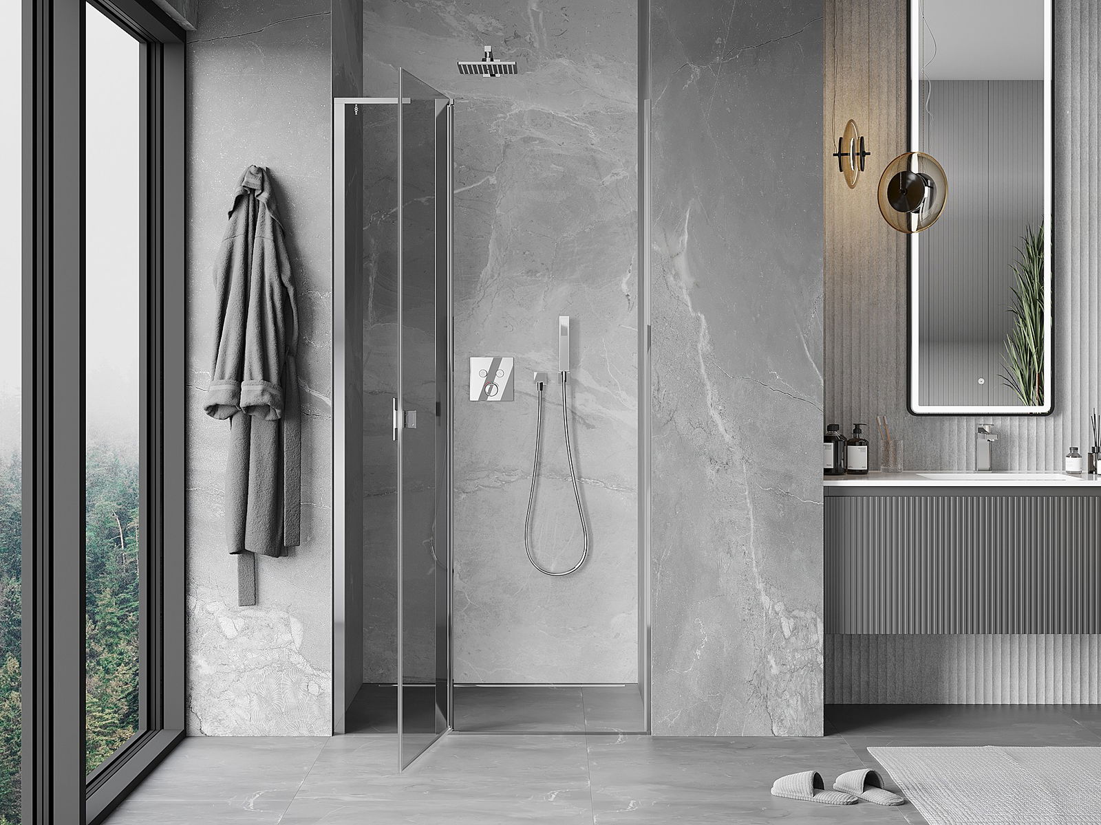 Priročen in udoben ročaj je izdelan iz trpežnega in odpornega kovine. Modna oblika v kombinaciji z zaključkom, ki ustreza barvi profilov, daje celoti sodoben in stilski videz, poudarjajoč estetiko vsake kopalnice.