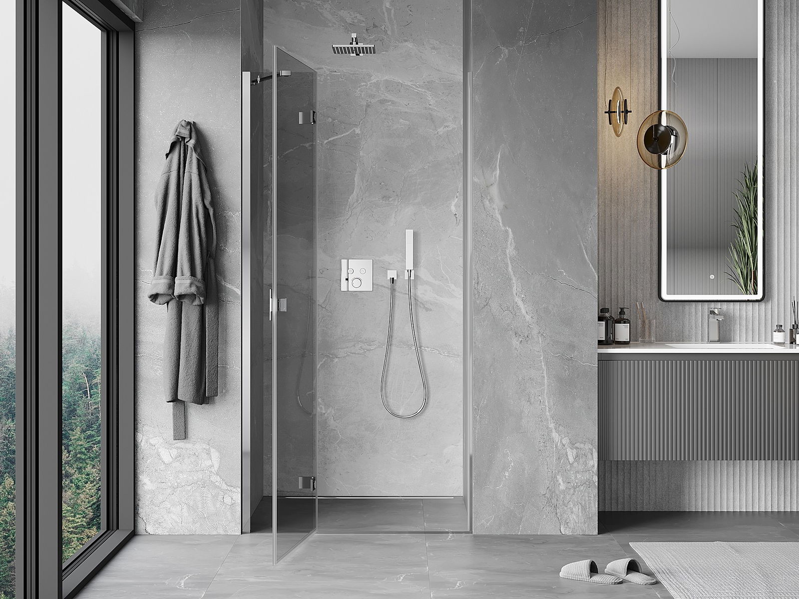 Priročen in udoben ročaj je izdelan iz trpežnega in odpornega kovine. Modna oblika v kombinaciji z zaključkom, ki ustreza barvi profilov, daje celoti sodoben in stilski videz, poudarjajoč estetiko vsake kopalnice.
