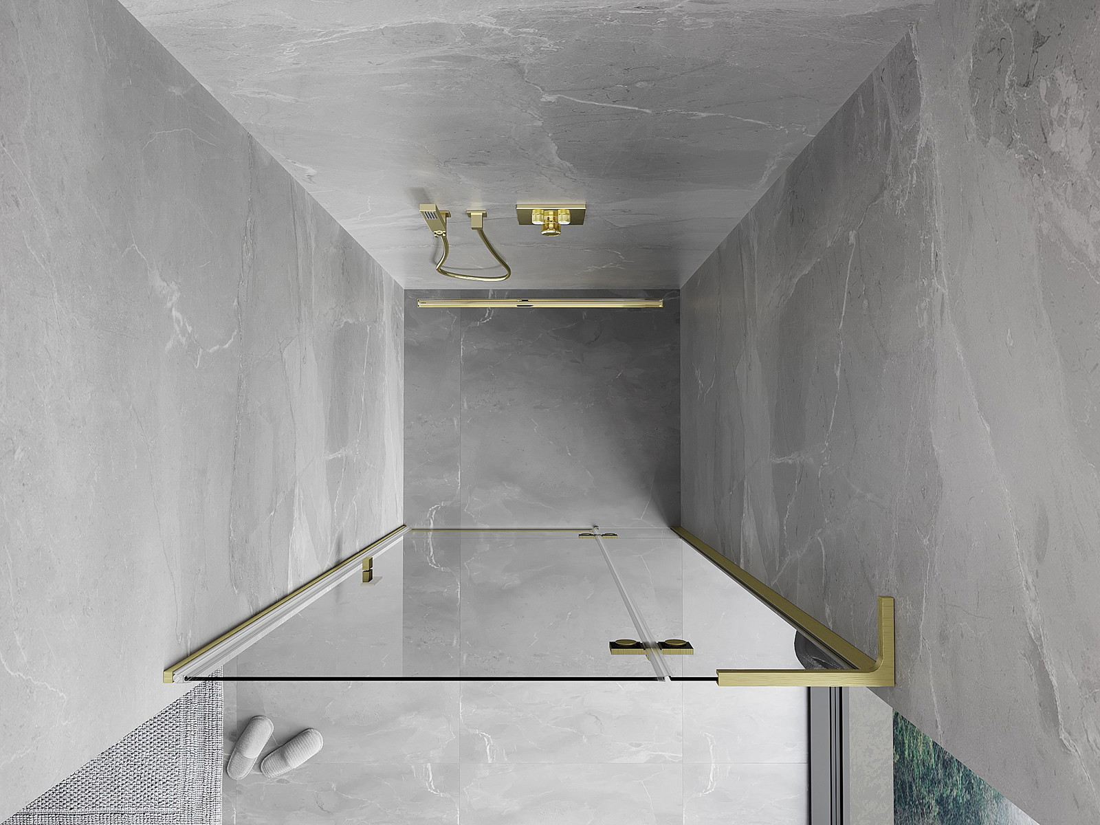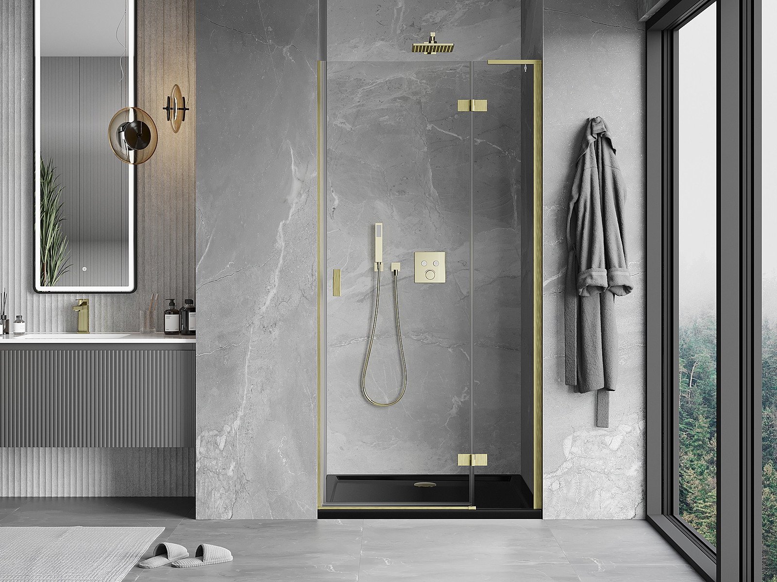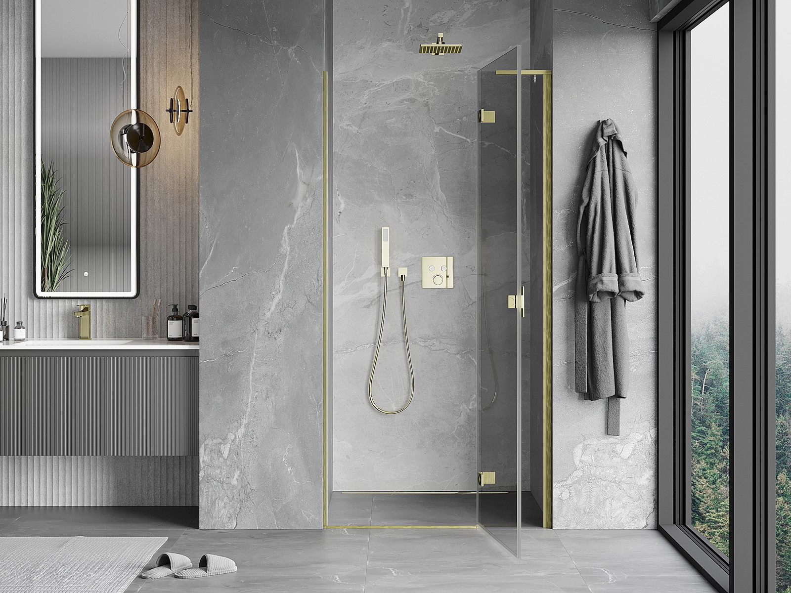 Priročen in udoben ročaj je izdelan iz trpežnega in odpornega kovine. Modna oblika v kombinaciji z zaključkom, ki ustreza barvi profilov, daje celoti sodoben in stilski videz, poudarjajoč estetiko vsake kopalnice.