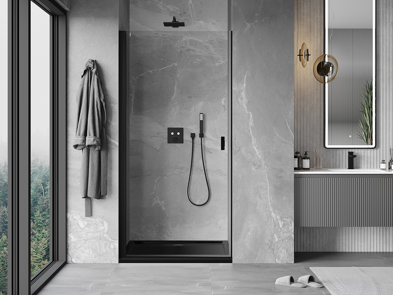 Priročen in udoben ročaj je izdelan iz trpežnega in odpornega kovine. Modna oblika v kombinaciji z zaključkom, ki ustreza barvi profilov, daje celoti sodoben in stilski videz, poudarjajoč estetiko vsake kopalnice.