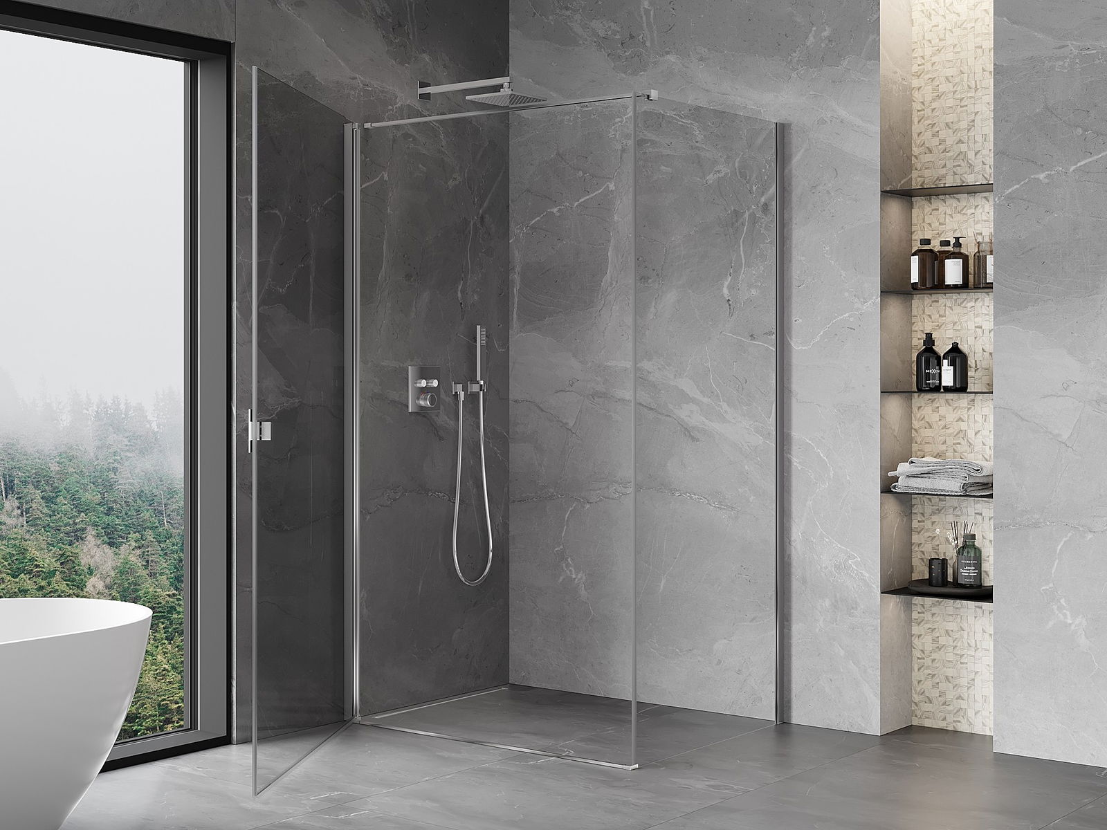 Priročen in udoben ročaj je izdelan iz trpežnega in odpornega kovine. Modna oblika v kombinaciji z zaključkom, ki ustreza barvi profilov, daje celoti sodoben in stilski videz, poudarjajoč estetiko vsake kopalnice.