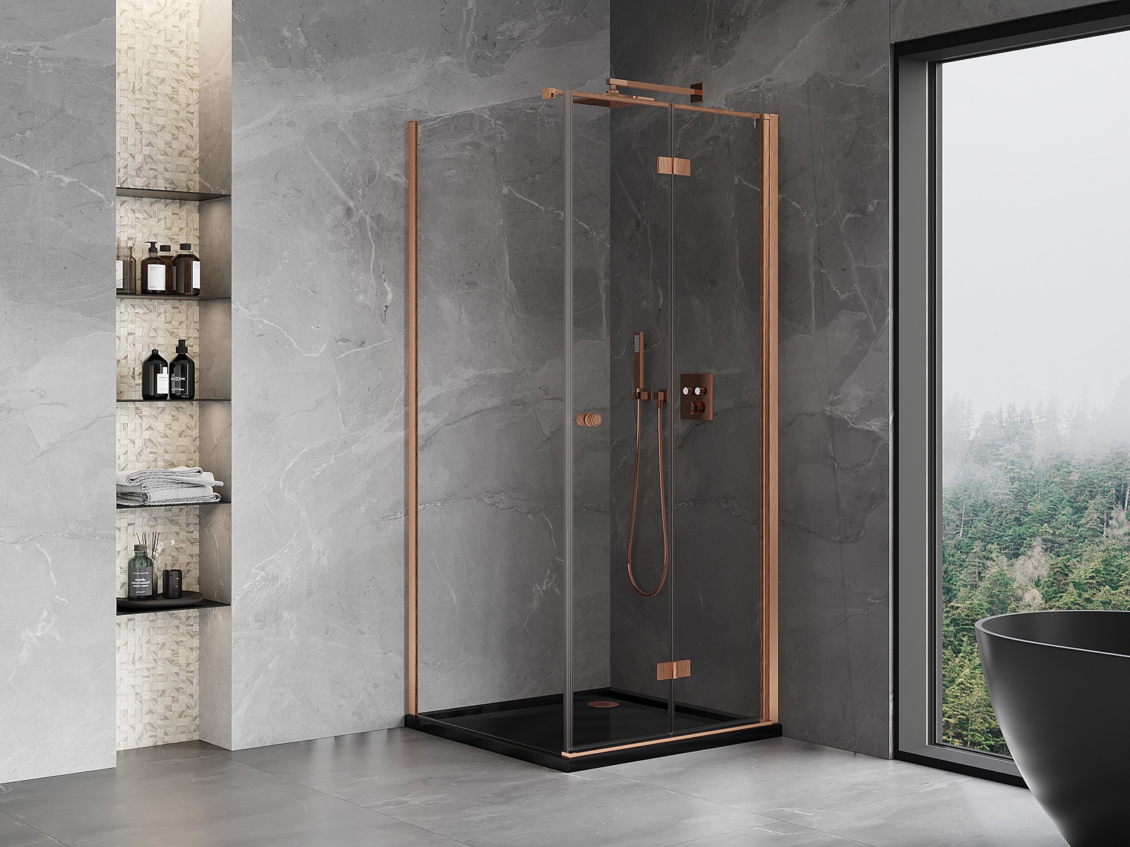 Priročen in udoben ročaj je izdelan iz trpežnega in odpornega kovine. Modna oblika v kombinaciji z zaključkom, ki ustreza barvi profilov, daje celoti sodoben in stilski videz, poudarjajoč estetiko vsake kopalnice.