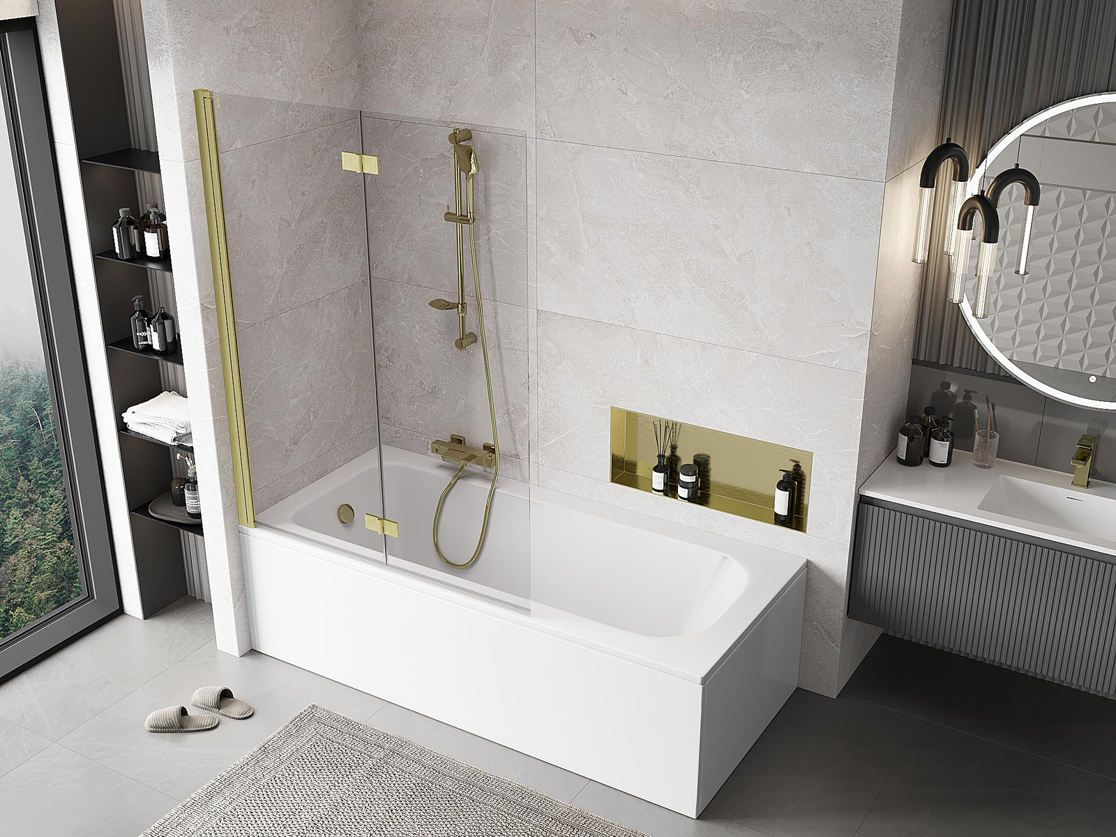 Zaslon izdelan iz dveh kril z možnostjo zlaganja. Takšna rešitev omogoča prihranek prostora v kopalnici in omogoča prosto uporabo preostalega prostora, ko ne uporabljamo kopalne cone.