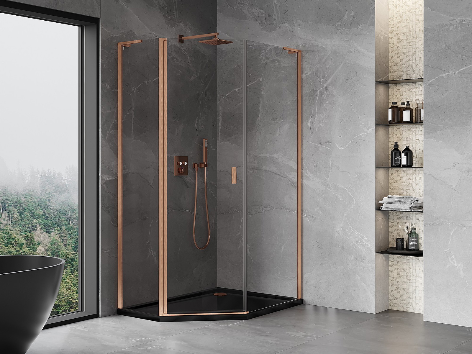 Mexen Mist L asimetrična petkotna tuš kabina s tečajnimi vrati 80x100 cm, prozorna, brušen baker - 8A8L-080-100-65-00