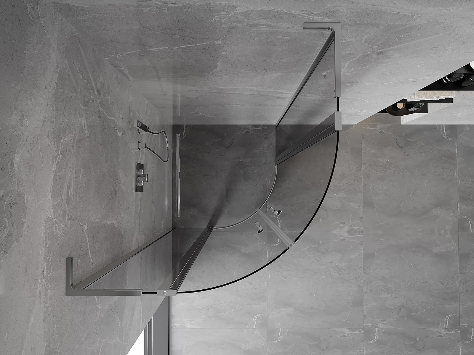 Priročen in udoben ročaj je izdelan iz trpežnega in odpornega kovine. Modna oblika v kombinaciji z zaključkom, ki ustreza barvi profilov, daje celoti sodoben in stilski videz, poudarjajoč estetiko vsake kopalnice.
