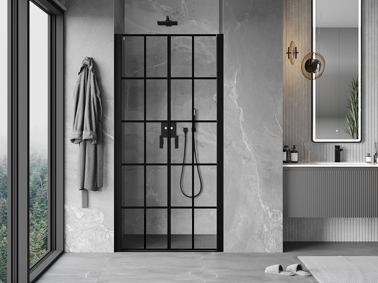 Priročen in udoben ročaj je izdelan iz trpežnega in odpornega kovine. Modna oblika v kombinaciji z zaključkom, ki ustreza barvi profilov, daje celoti sodoben in stilski videz, poudarjajoč estetiko vsake kopalnice.