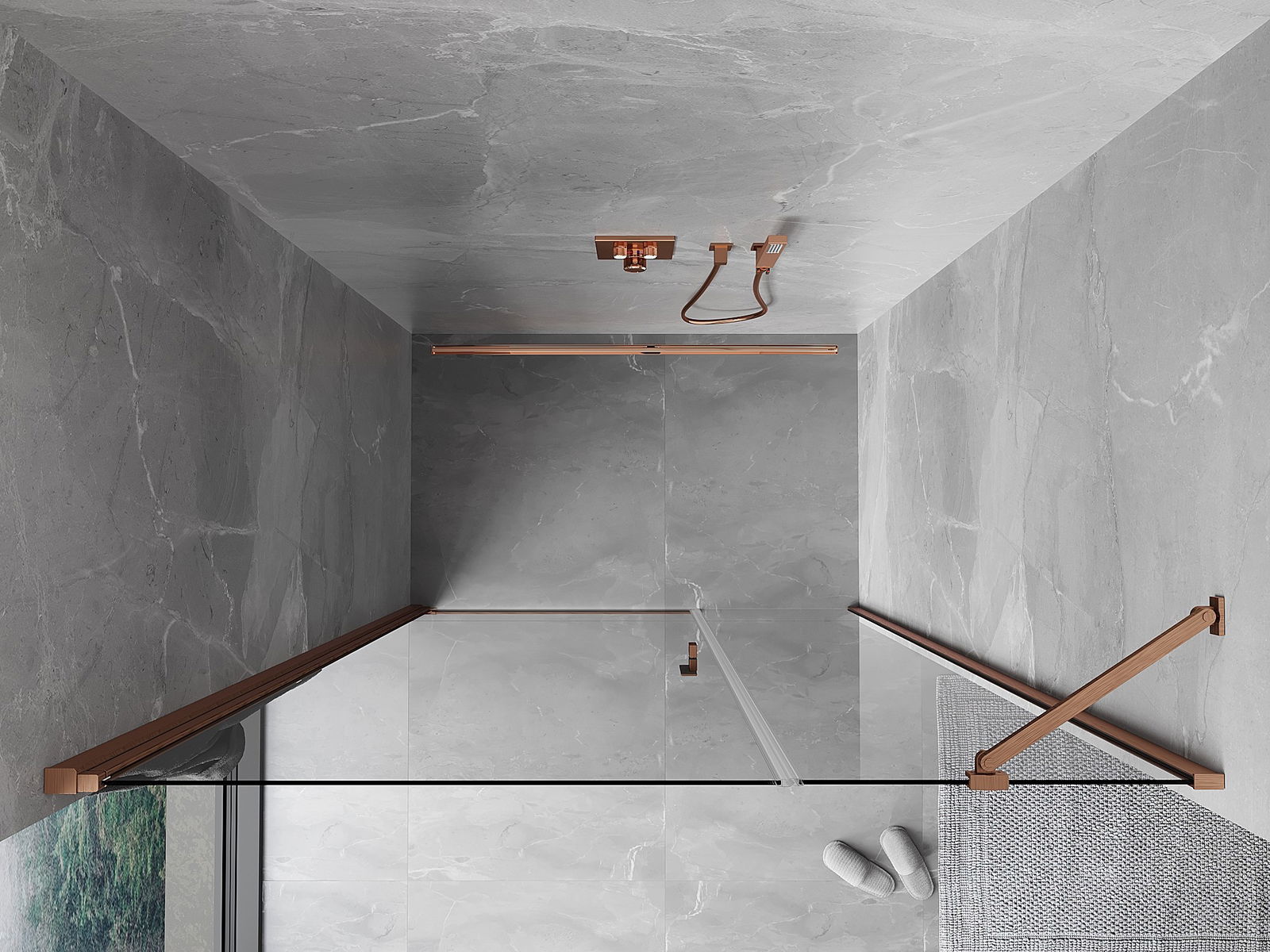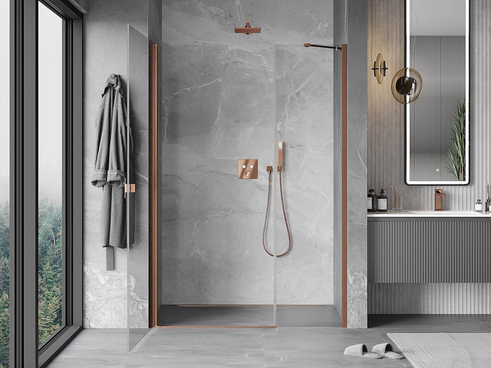 Priročen in udoben ročaj je izdelan iz trpežnega in odpornega kovine. Modna oblika v kombinaciji z zaključkom, ki ustreza barvi profilov, daje celoti sodoben in stilski videz, poudarjajoč estetiko vsake kopalnice.