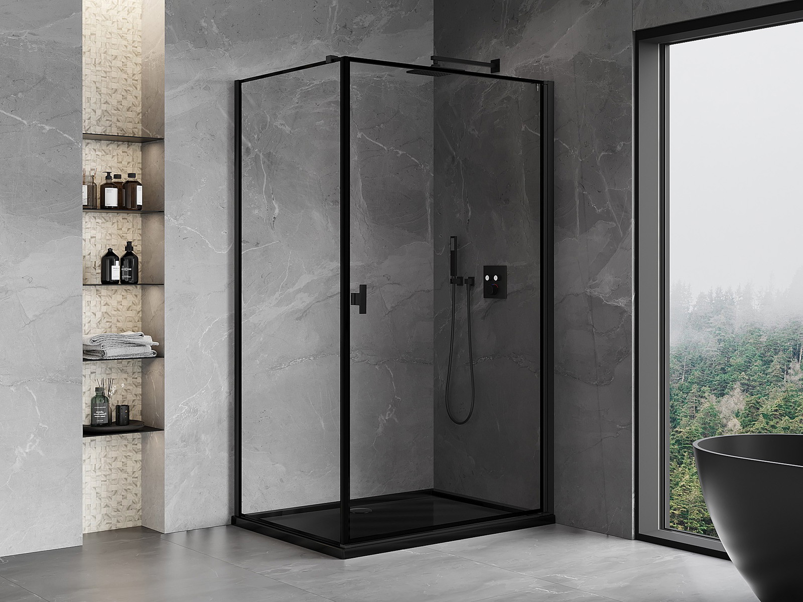 Priročen in udoben ročaj je izdelan iz trpežnega in odpornega kovine. Modna oblika v kombinaciji z zaključkom, ki ustreza barvi profilov, daje celoti sodoben in stilski videz, poudarjajoč estetiko vsake kopalnice.
