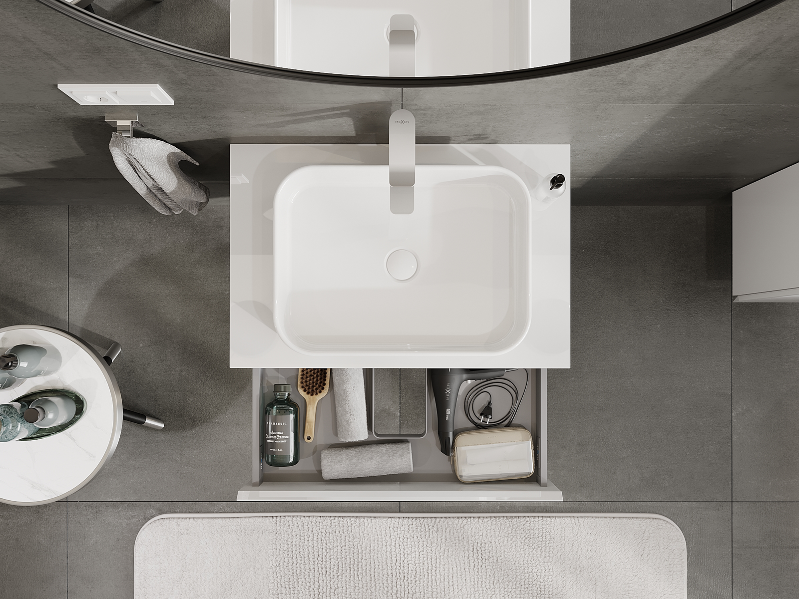 Izrez v predalu je zasnovan tako, da sprejme sifon, ki je nujen v umivalniških instalacijah. S tem je mogoče pohištvo popolnoma funkcionalno namestiti, ne da bi se morali odpovedati prostoru v predalu zaradi instalacije.