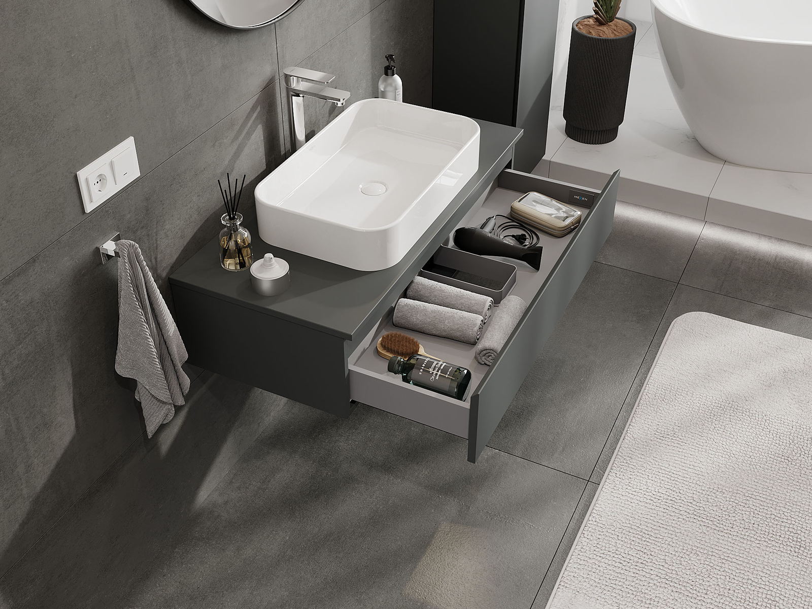 Zaradi trdnih materialov, natančne izdelave in sodobnih tehnoloških rešitev izdelek zagotavlja udobje uporabe, odpornost proti vlagi in spremembam temperature, pa tudi eleganten videz, ki se prilega različnim slogom kopalnic.