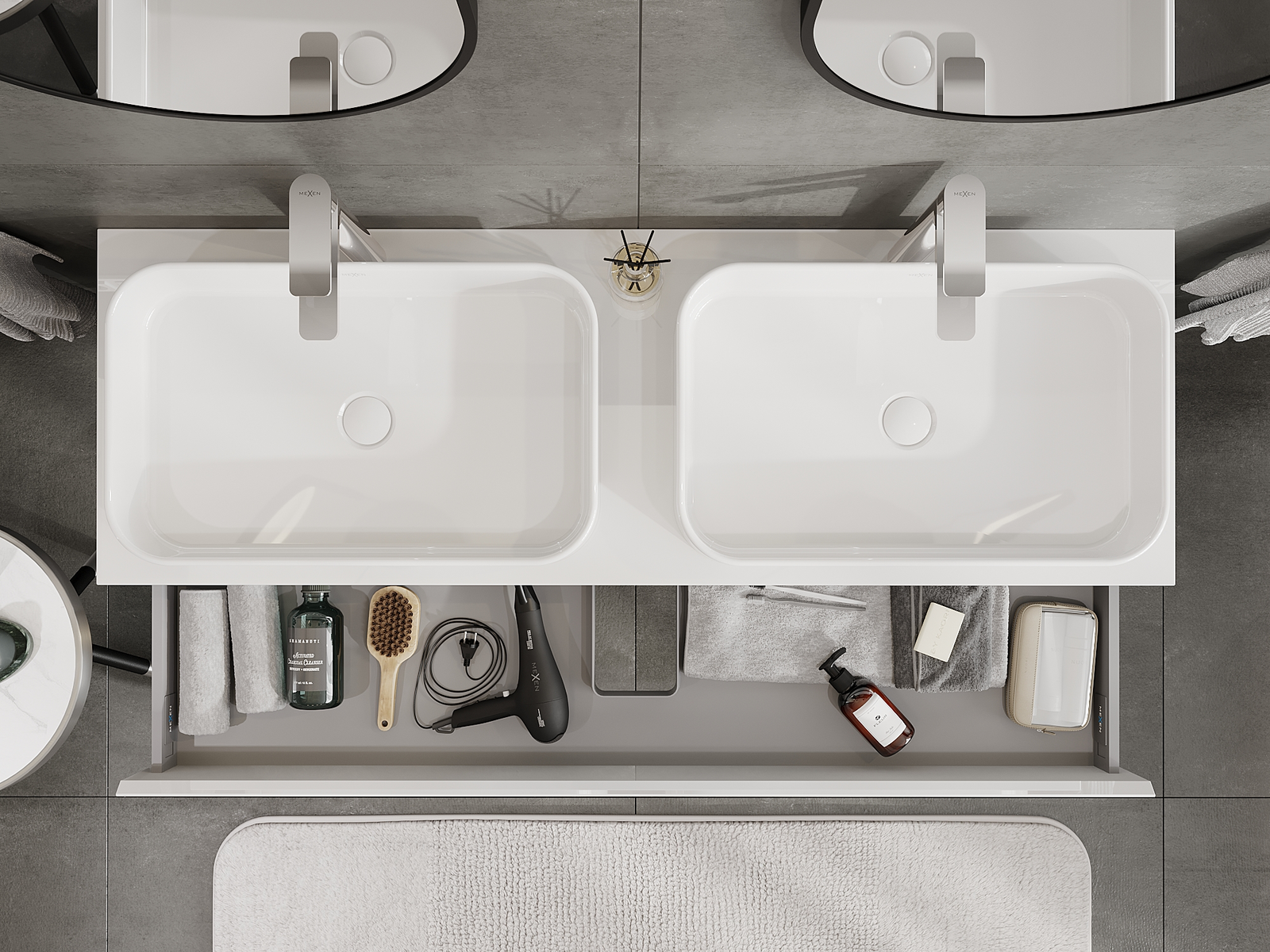Izrez v predalu je zasnovan tako, da sprejme sifon, ki je nujen v umivalniških instalacijah. S tem je mogoče pohištvo popolnoma funkcionalno namestiti, ne da bi se morali odpovedati prostoru v predalu zaradi instalacije.