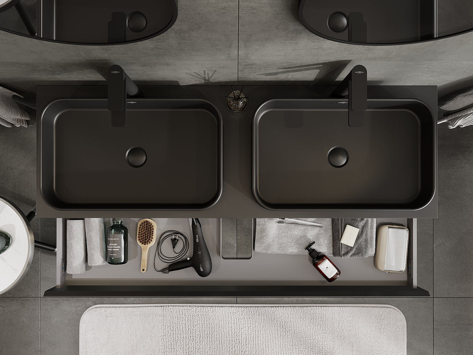 Izrez v predalu je zasnovan tako, da sprejme sifon, ki je nujen v umivalniških instalacijah. S tem je mogoče pohištvo popolnoma funkcionalno namestiti, ne da bi se morali odpovedati prostoru v predalu zaradi instalacije.