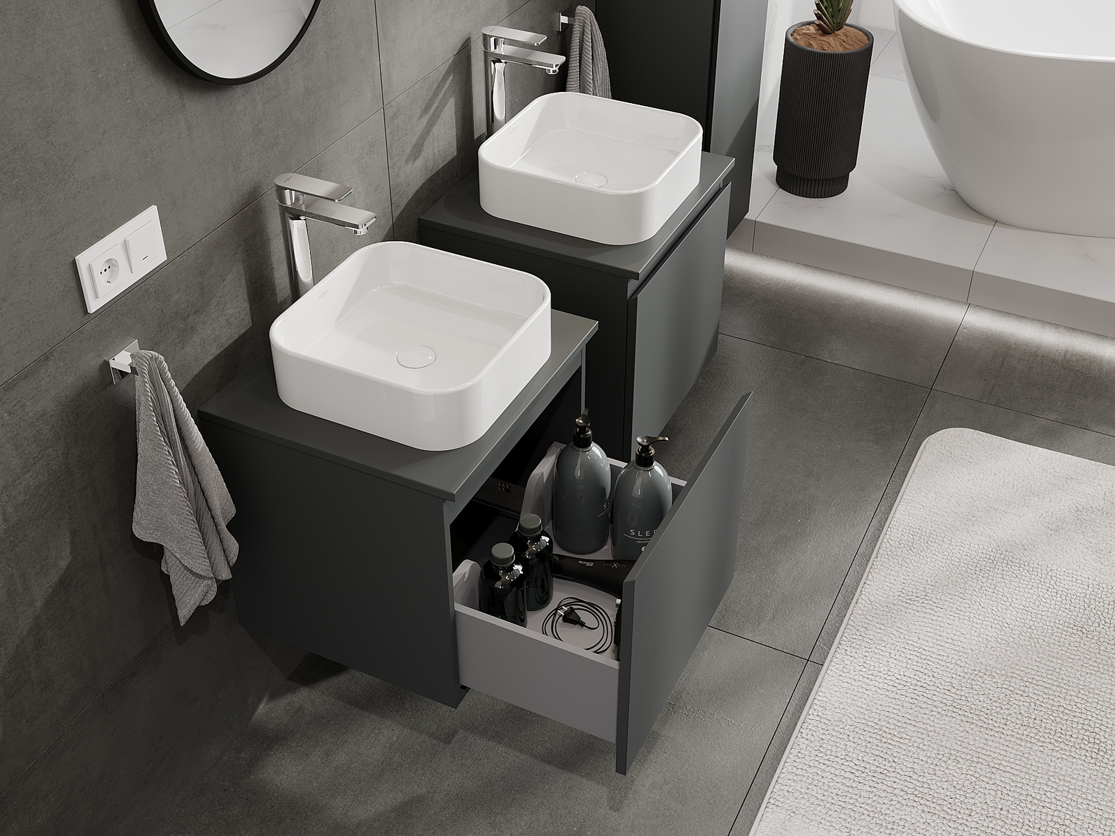Naše modularno pohištvo za kopalnice je mogoče združevati v različnih barvnih konfiguracijah, kar omogoča popolno personalizacijo. Možno je izbrati tako videz kot funkcije posameznih elementov, kar omogoča prilagoditev pohištva vašim slogovnim in uporabniškim preferencam.