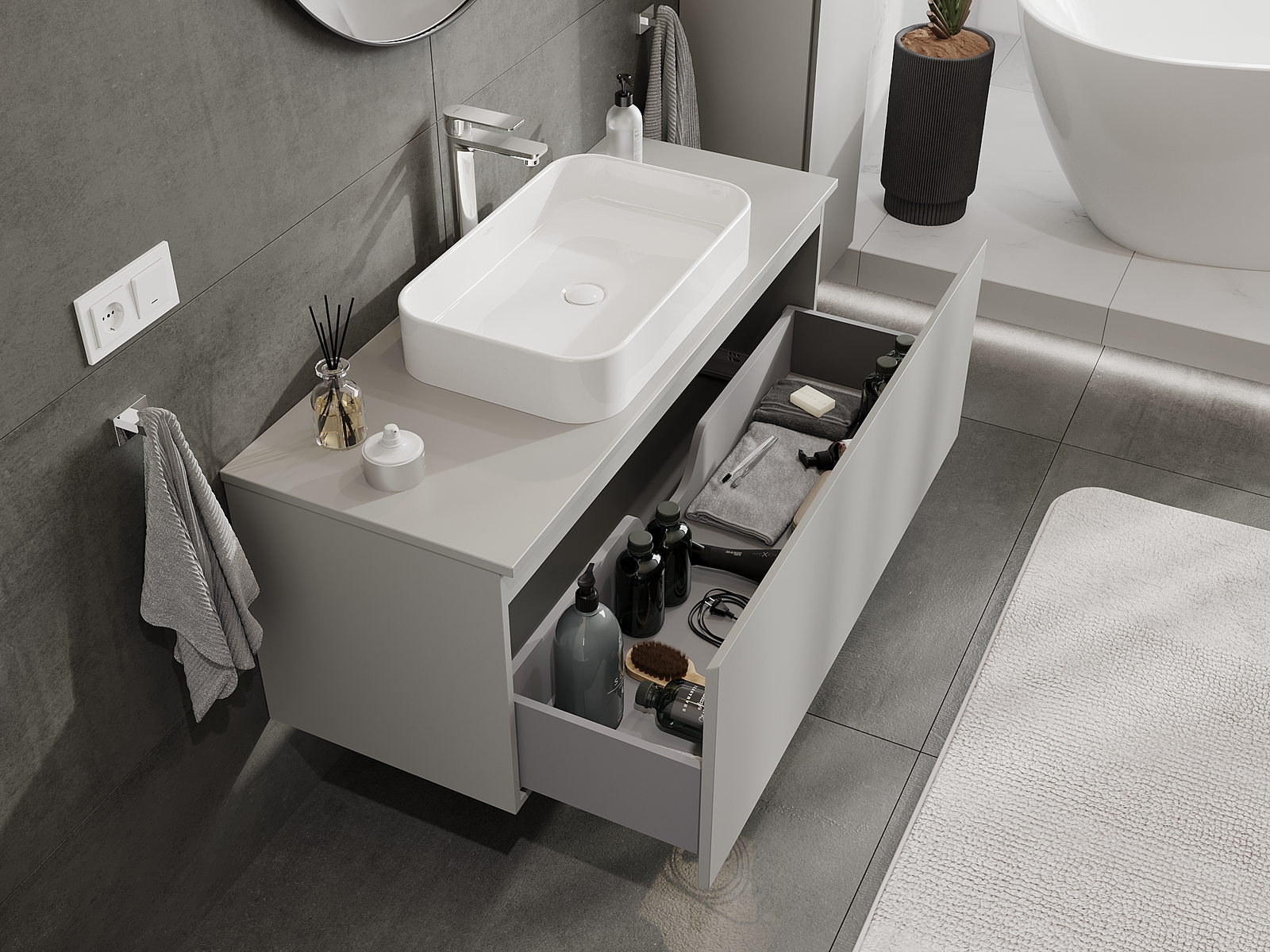 Zaradi trdnih materialov, natančne izdelave in sodobnih tehnoloških rešitev izdelek zagotavlja udobje uporabe, odpornost proti vlagi in spremembam temperature, pa tudi eleganten videz, ki se prilega različnim slogom kopalnic.