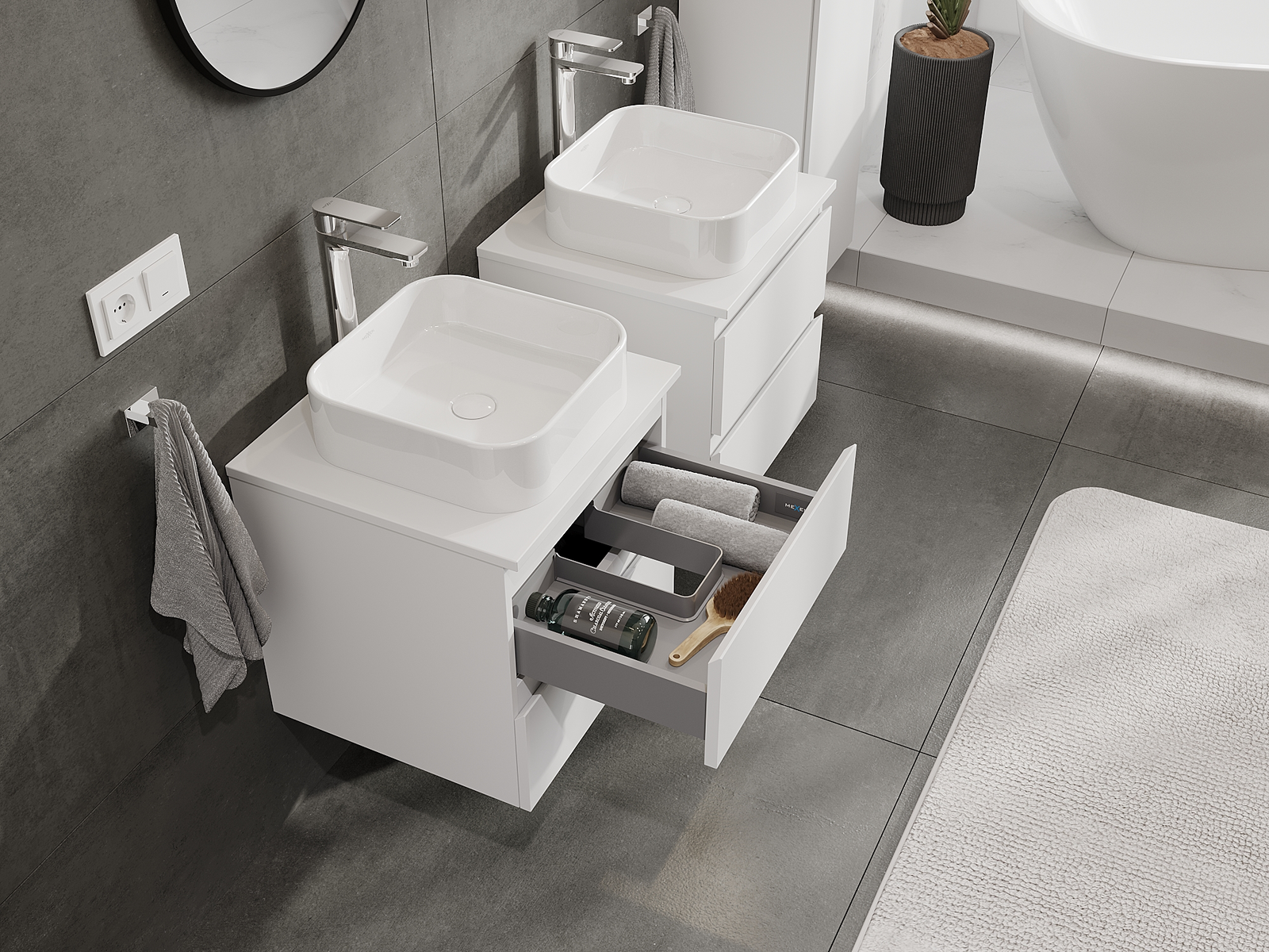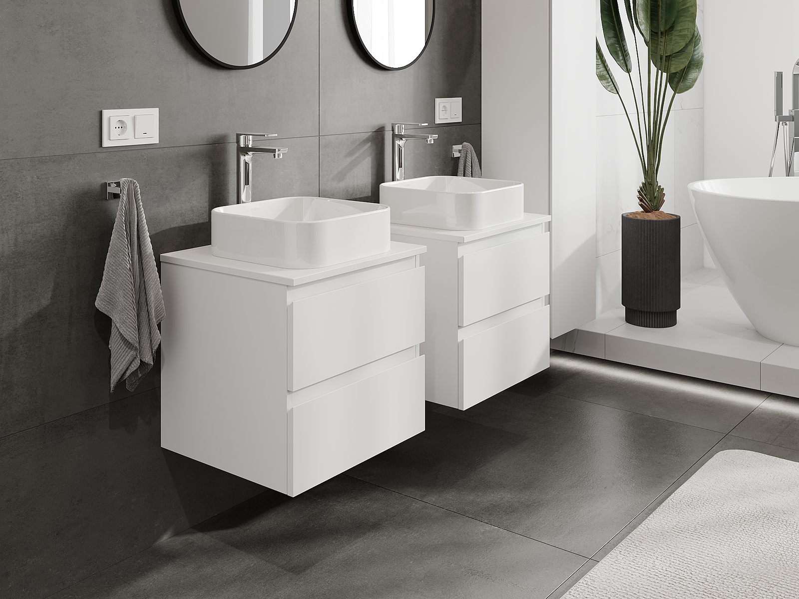 Naše modularno pohištvo za kopalnice je mogoče združevati v različnih barvnih konfiguracijah, kar omogoča popolno personalizacijo. Možno je izbrati tako videz kot funkcije posameznih elementov, kar omogoča prilagoditev pohištva vašim slogovnim in uporabniškim preferencam.
