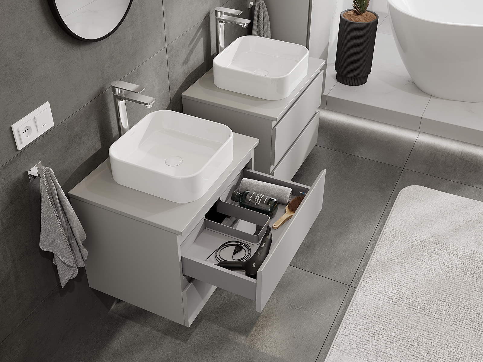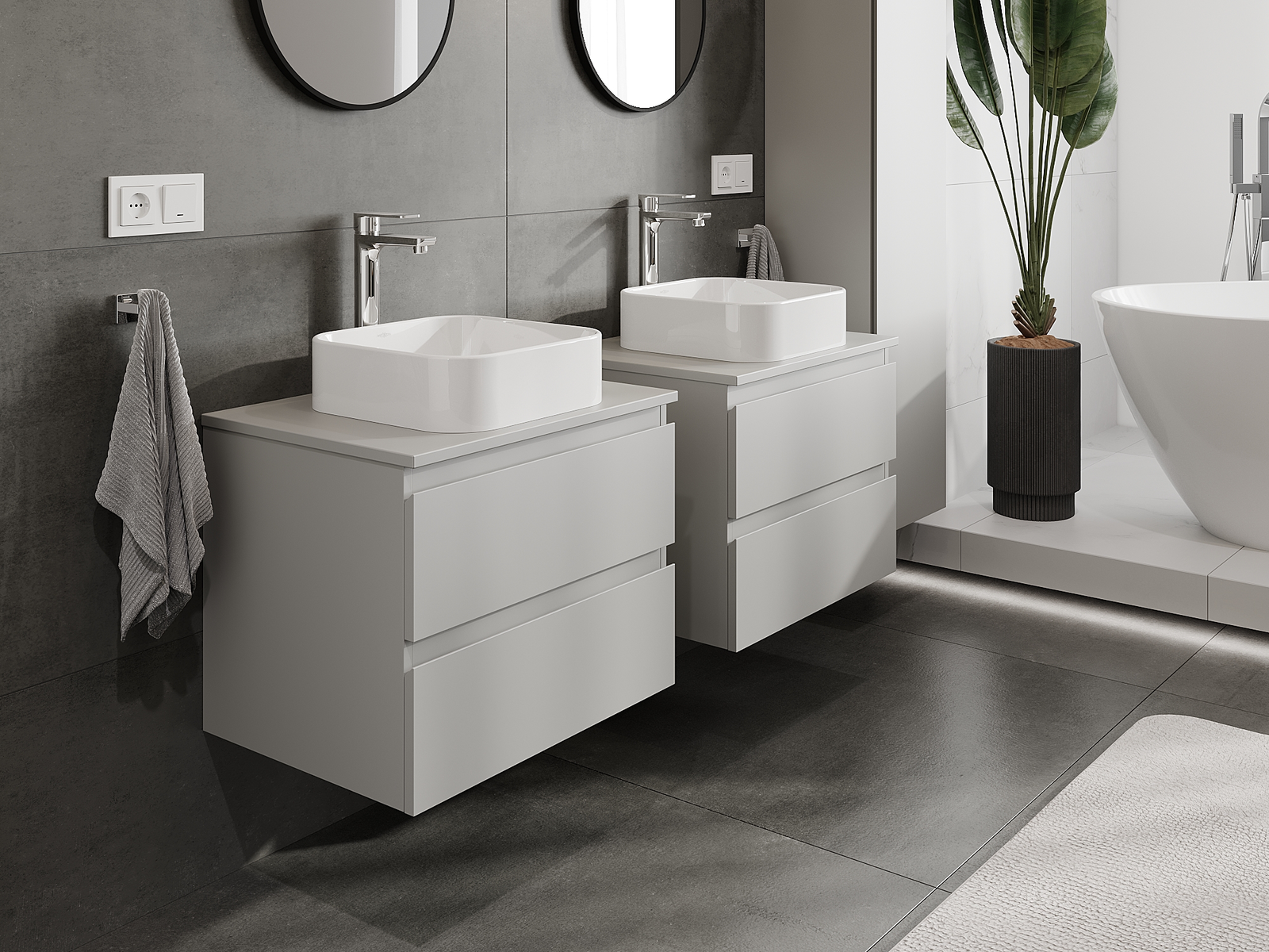 Naše modularno pohištvo za kopalnice je mogoče združevati v različnih barvnih konfiguracijah, kar omogoča popolno personalizacijo. Možno je izbrati tako videz kot funkcije posameznih elementov, kar omogoča prilagoditev pohištva vašim slogovnim in uporabniškim preferencam.