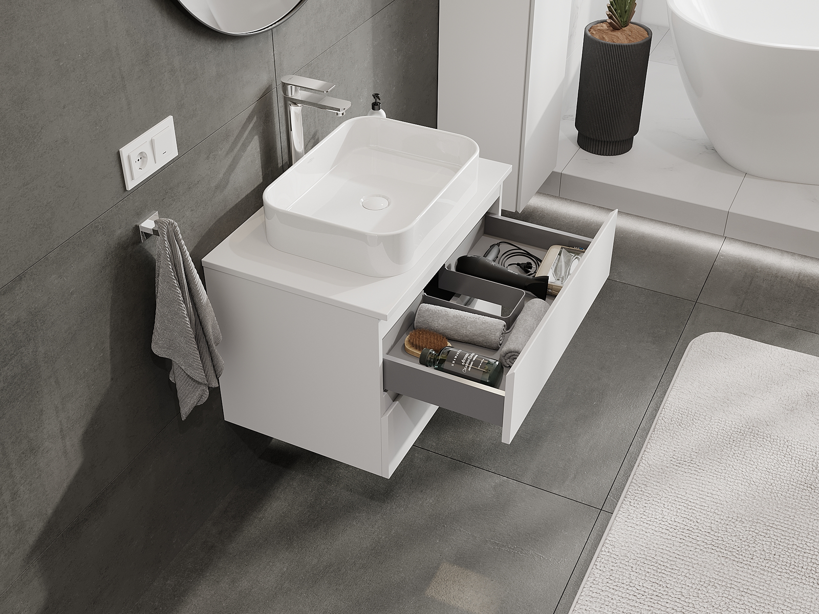 Izrez v predalu je zasnovan tako, da sprejme sifon, ki je nujen v umivalniških instalacijah. S tem je mogoče pohištvo popolnoma funkcionalno namestiti, ne da bi se morali odpovedati prostoru v predalu zaradi instalacije.