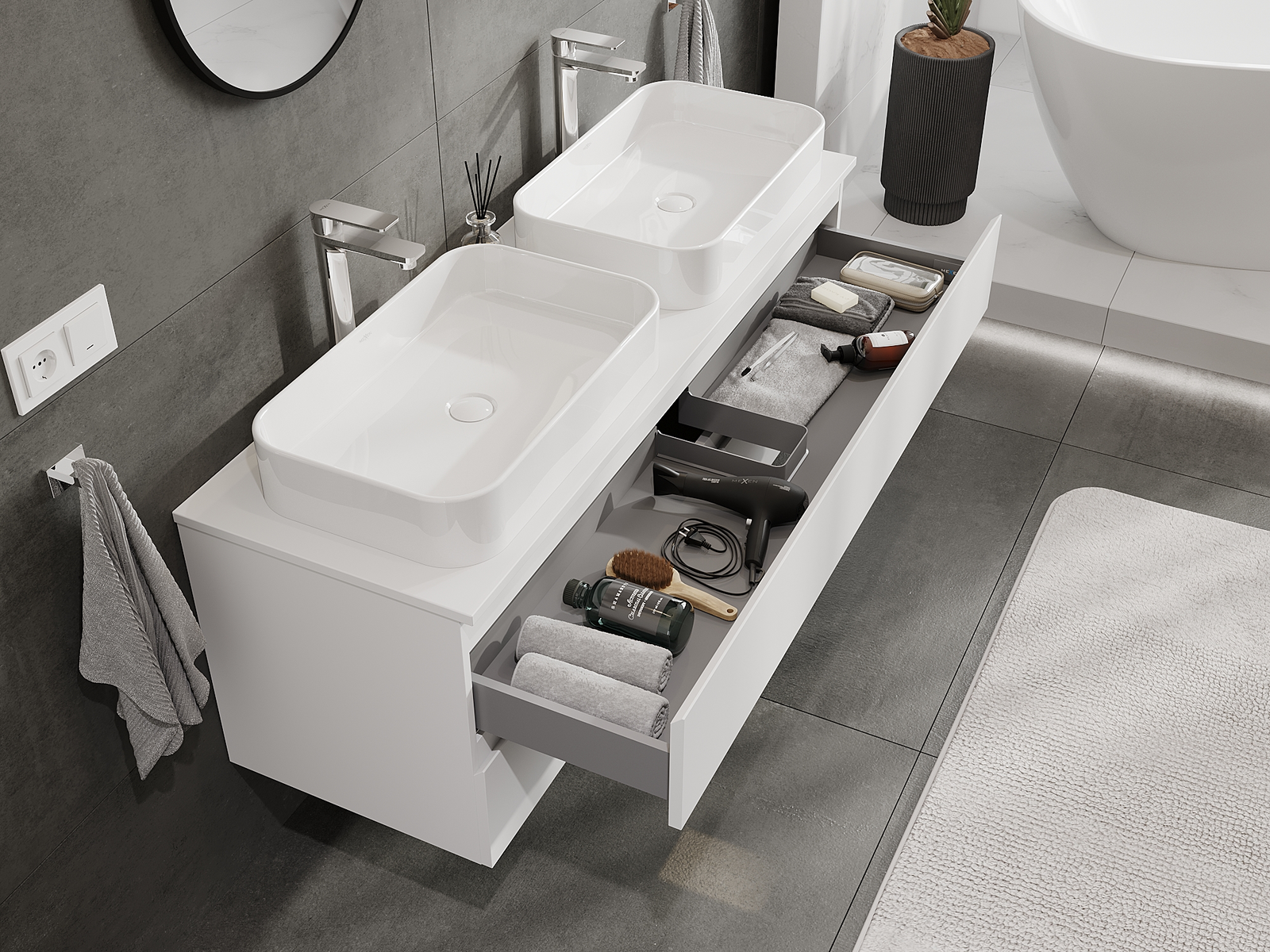 Zaradi trdnih materialov, natančne izdelave in sodobnih tehnoloških rešitev izdelek zagotavlja udobje uporabe, odpornost proti vlagi in spremembam temperature, pa tudi eleganten videz, ki se prilega različnim slogom kopalnic.