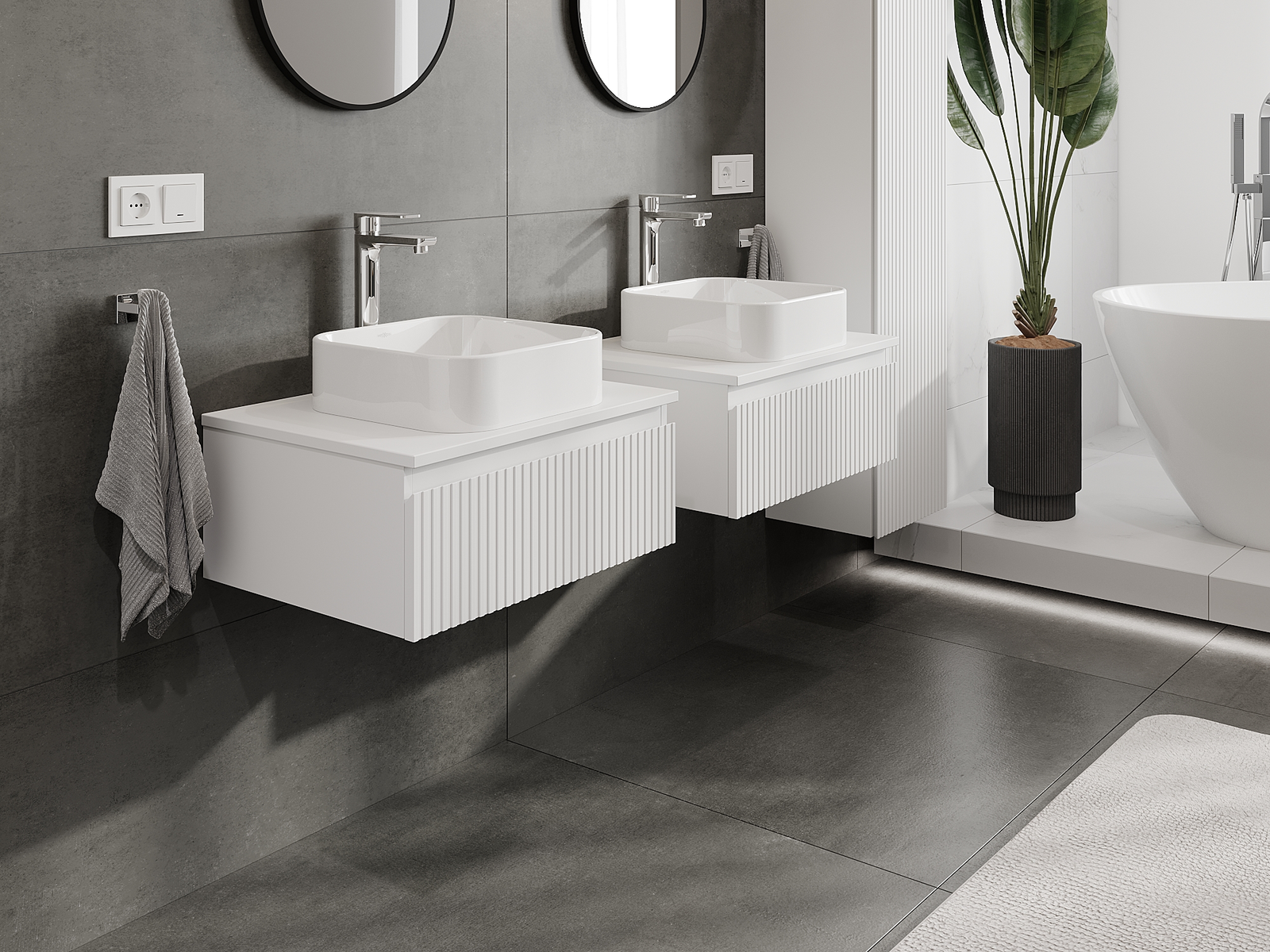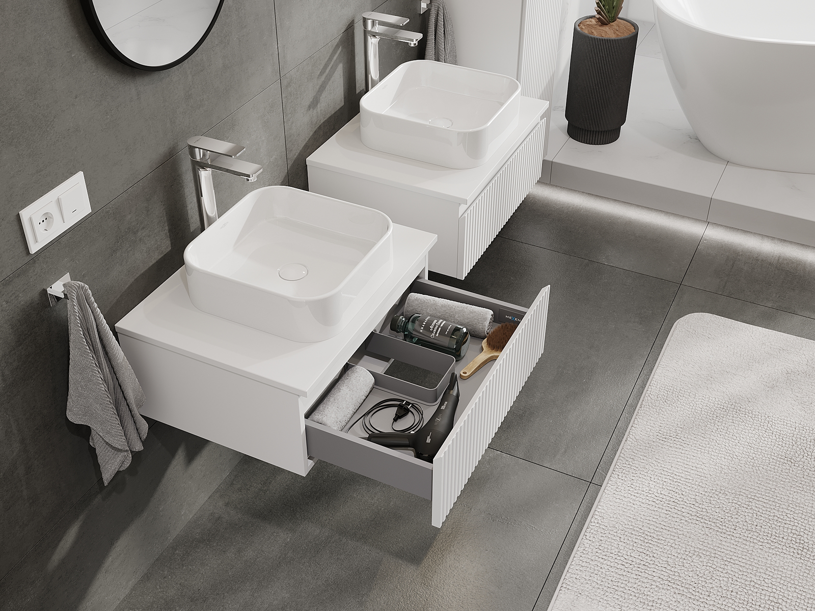 Naše modularno pohištvo za kopalnice je mogoče združevati v različnih barvnih konfiguracijah, kar omogoča popolno personalizacijo. Možno je izbrati tako videz kot funkcije posameznih elementov, kar omogoča prilagoditev pohištva vašim slogovnim in uporabniškim preferencam.
