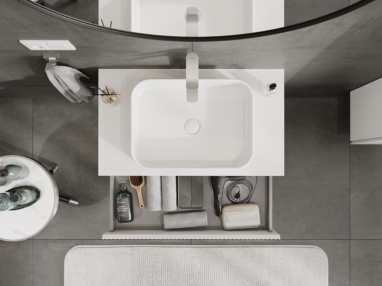Izrez v predalu je zasnovan tako, da sprejme sifon, ki je nujen v umivalniških instalacijah. S tem je mogoče pohištvo popolnoma funkcionalno namestiti, ne da bi se morali odpovedati prostoru v predalu zaradi instalacije.