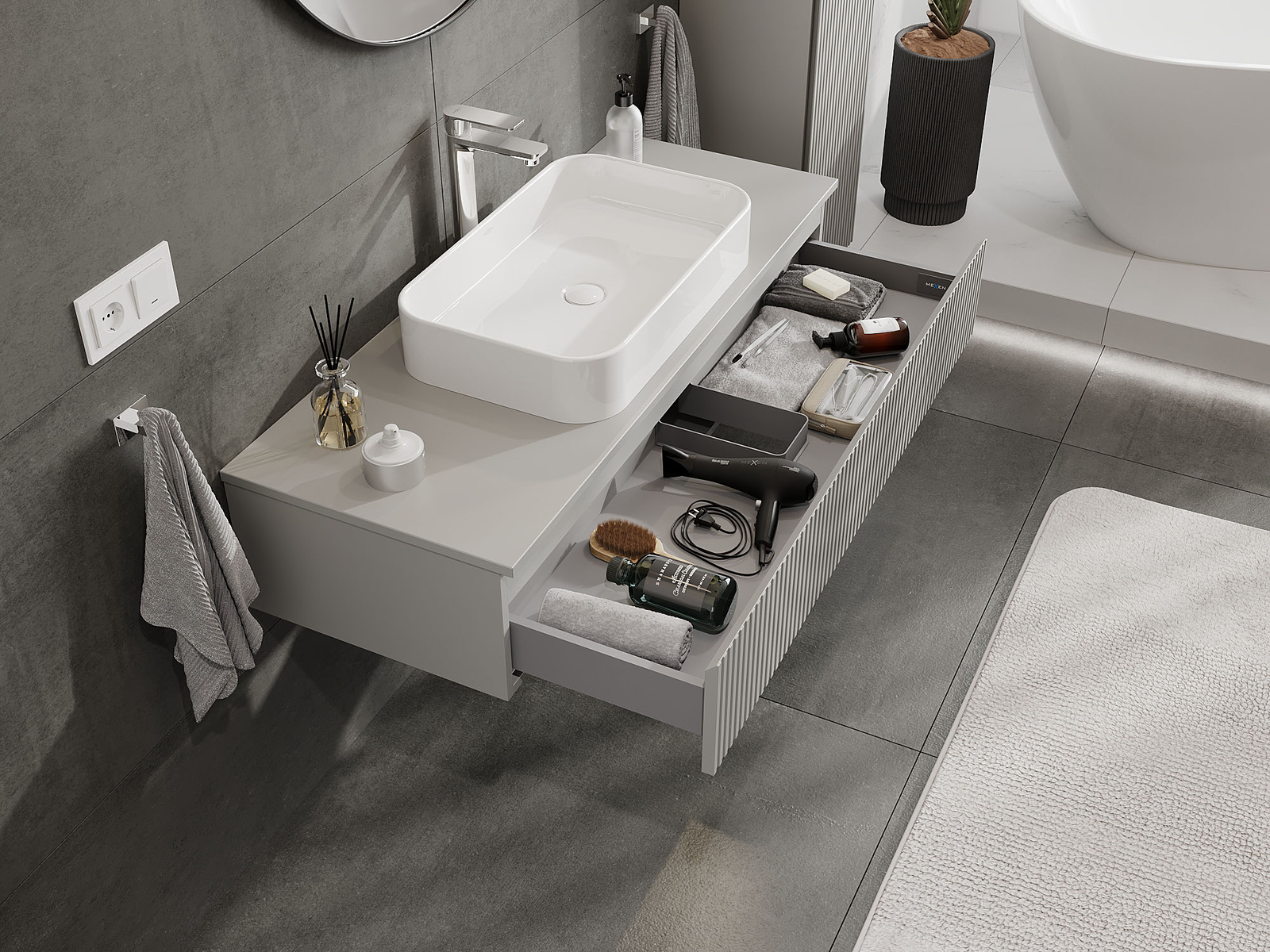 Zaradi trdnih materialov, natančne izdelave in sodobnih tehnoloških rešitev izdelek zagotavlja udobje uporabe, odpornost proti vlagi in spremembam temperature, pa tudi eleganten videz, ki se prilega različnim slogom kopalnic.
