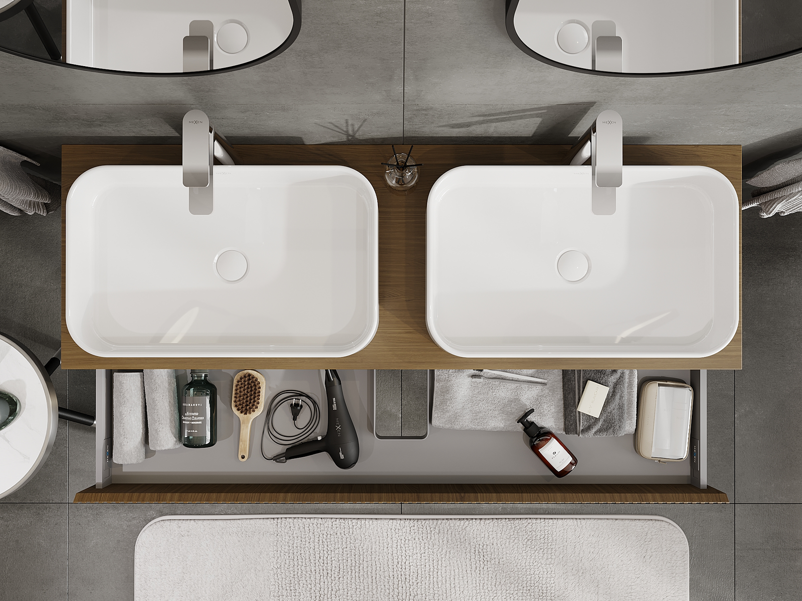 Izrez v predalu je zasnovan tako, da sprejme sifon, ki je nujen v umivalniških instalacijah. S tem je mogoče pohištvo popolnoma funkcionalno namestiti, ne da bi se morali odpovedati prostoru v predalu zaradi instalacije.