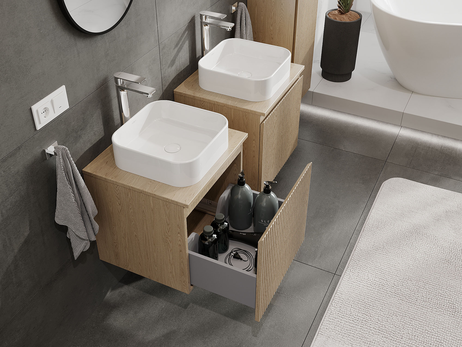 Naše modularno pohištvo za kopalnice je mogoče združevati v različnih barvnih konfiguracijah, kar omogoča popolno personalizacijo. Možno je izbrati tako videz kot funkcije posameznih elementov, kar omogoča prilagoditev pohištva vašim slogovnim in uporabniškim preferencam.