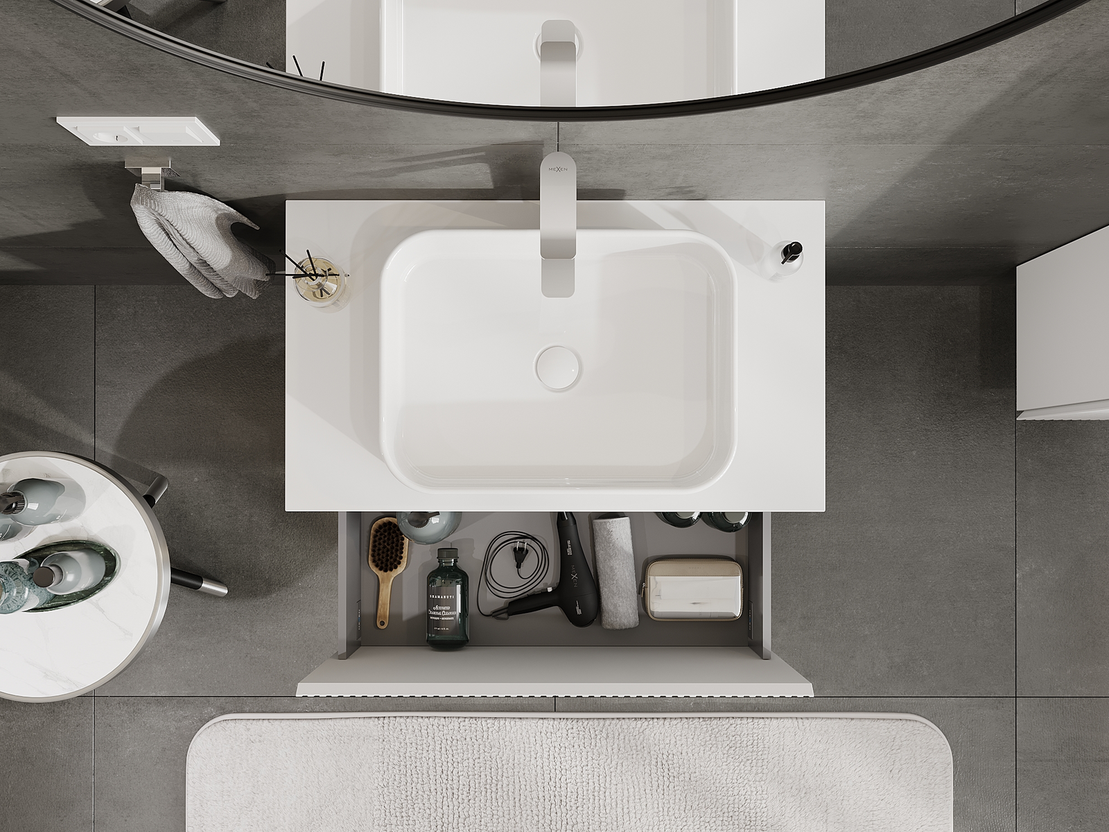 Izrez v predalu je zasnovan tako, da sprejme sifon, ki je nujen v umivalniških instalacijah. S tem je mogoče pohištvo popolnoma funkcionalno namestiti, ne da bi se morali odpovedati prostoru v predalu zaradi instalacije.