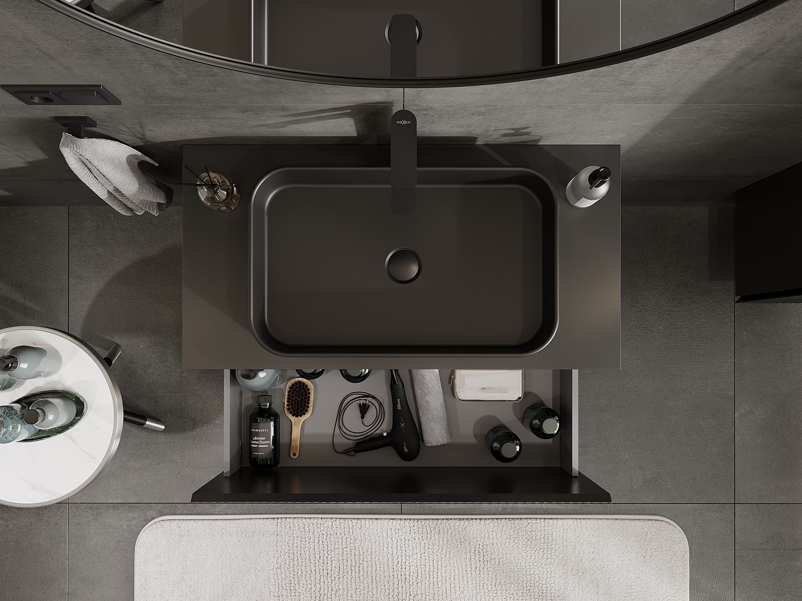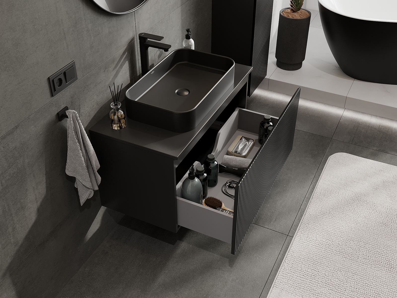 Izrez v predalu je zasnovan tako, da sprejme sifon, ki je nujen v umivalniških instalacijah. S tem je mogoče pohištvo popolnoma funkcionalno namestiti, ne da bi se morali odpovedati prostoru v predalu zaradi instalacije.