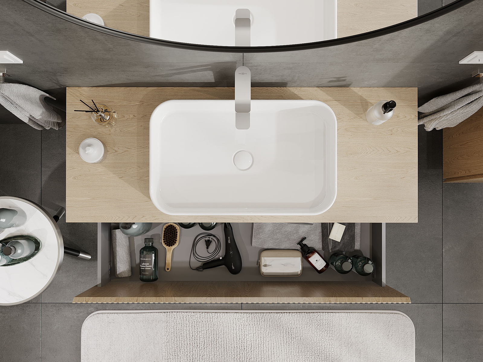 Izrez v predalu je zasnovan tako, da sprejme sifon, ki je nujen v umivalniških instalacijah. S tem je mogoče pohištvo popolnoma funkcionalno namestiti, ne da bi se morali odpovedati prostoru v predalu zaradi instalacije.