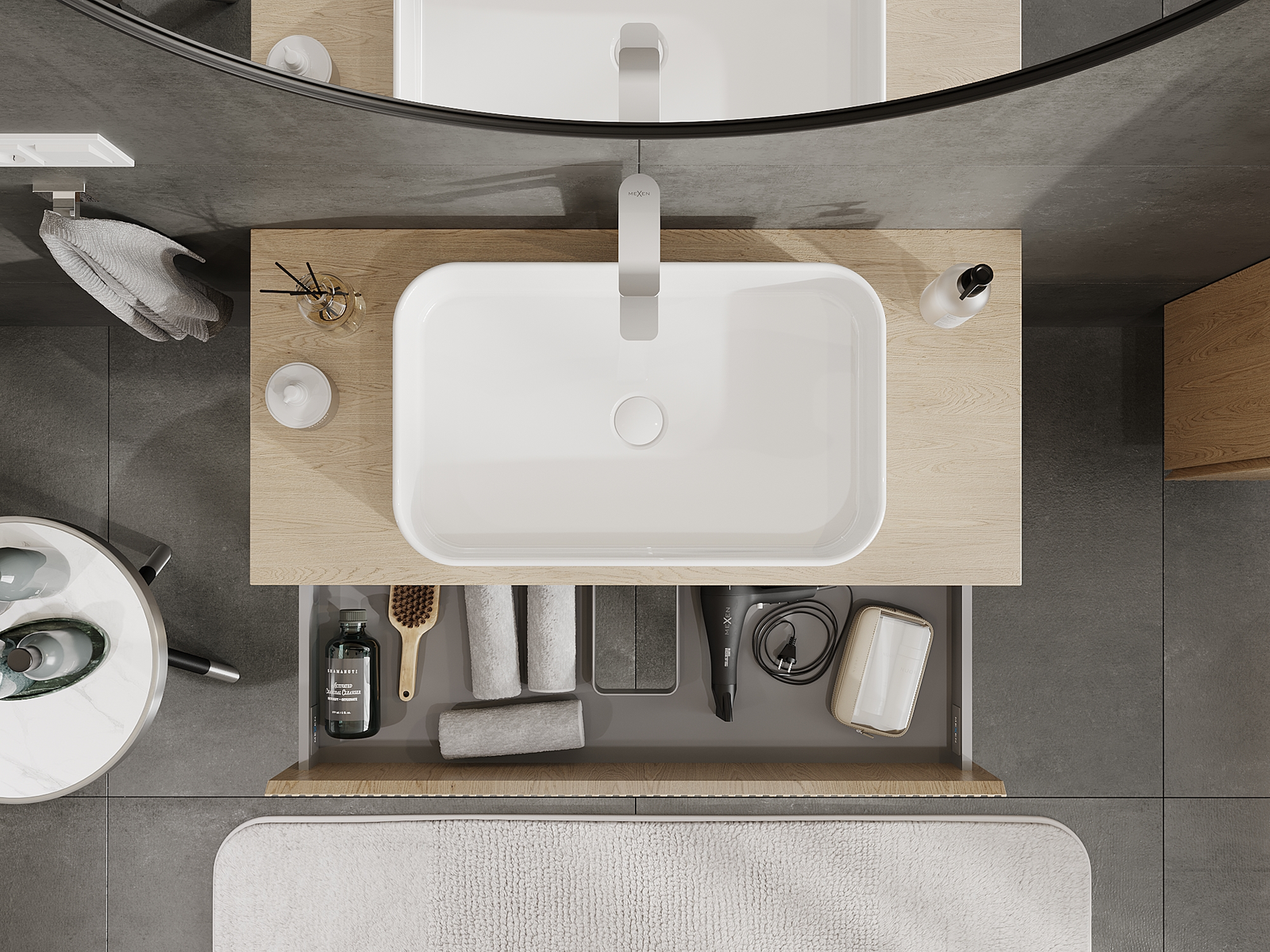 Izrez v predalu je zasnovan tako, da sprejme sifon, ki je nujen v umivalniških instalacijah. S tem je mogoče pohištvo popolnoma funkcionalno namestiti, ne da bi se morali odpovedati prostoru v predalu zaradi instalacije.