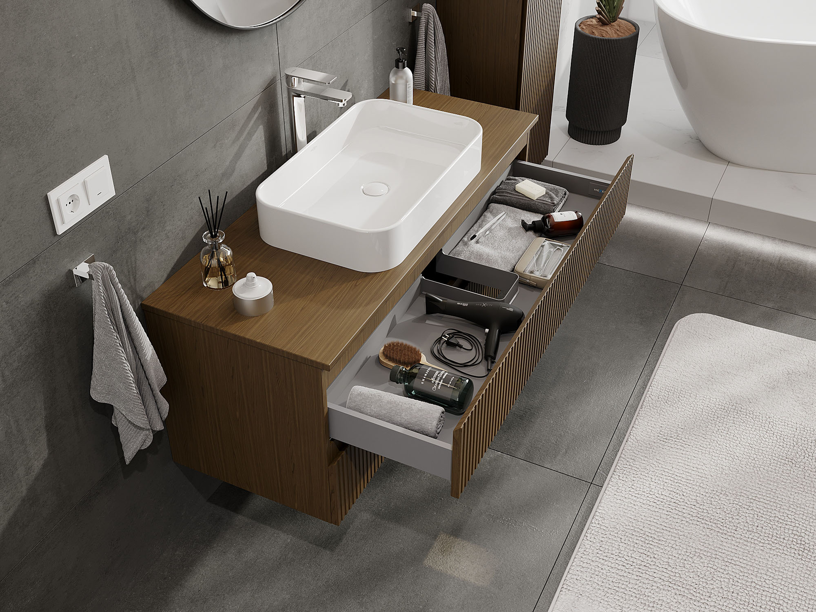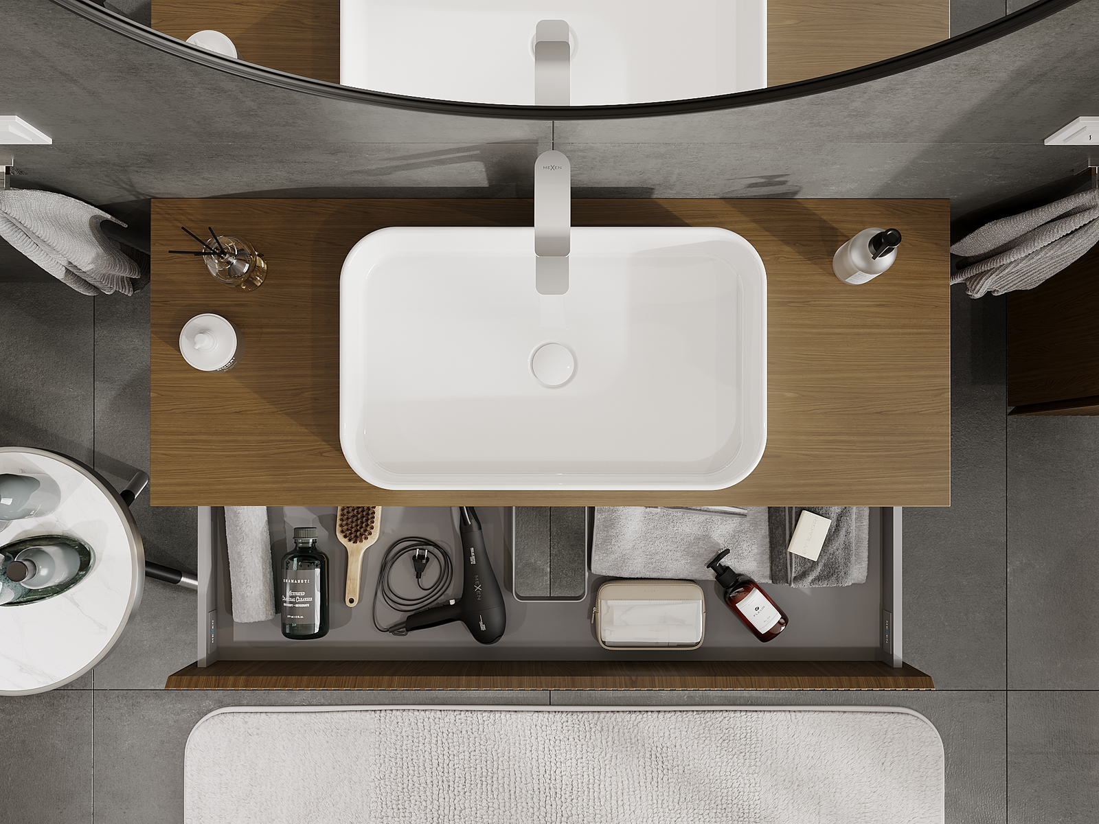 Izrez v predalu je zasnovan tako, da sprejme sifon, ki je nujen v umivalniških instalacijah. S tem je mogoče pohištvo popolnoma funkcionalno namestiti, ne da bi se morali odpovedati prostoru v predalu zaradi instalacije.