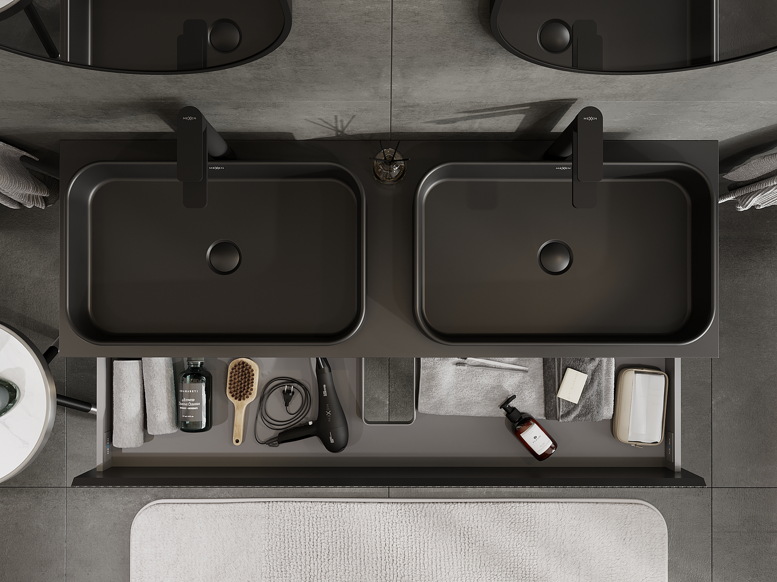 Izrez v predalu je zasnovan tako, da sprejme sifon, ki je nujen v umivalniških instalacijah. S tem je mogoče pohištvo popolnoma funkcionalno namestiti, ne da bi se morali odpovedati prostoru v predalu zaradi instalacije.